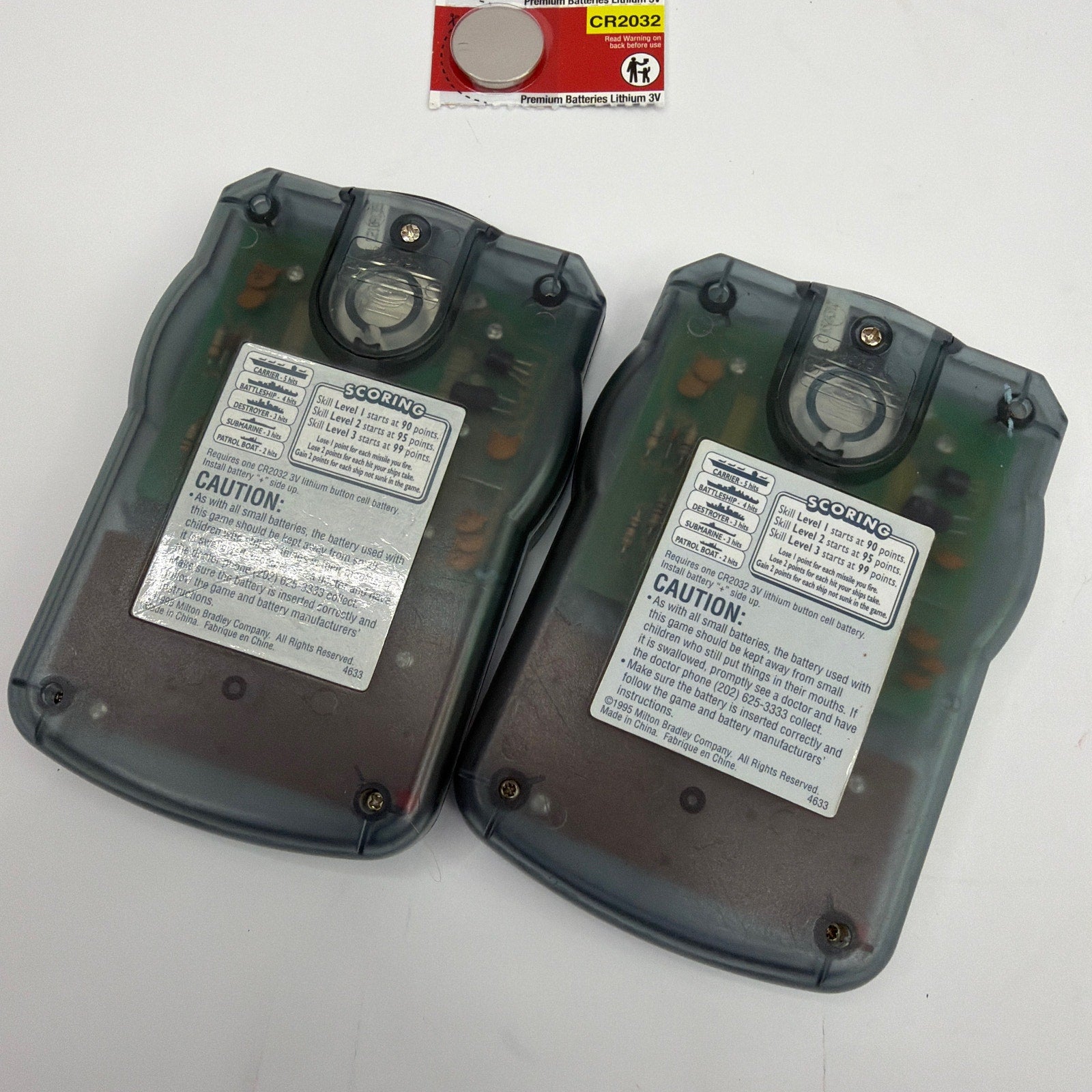 Lot of 2 Milton Bradley Electronic Hand-Held Battleship games (1995, model 4633). Tested working. Pre-owned with visible cosmetic wear from use/storage (scuffs, scratches, and some marks) as shown in photos. Includes both handheld games and extra CR2032 batteries; no other accessories are included.