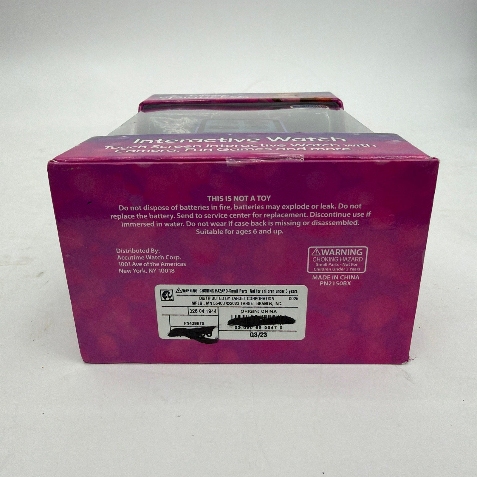 Accutime Disney Princess interactive touchscreen watch, model PN2150BX, with a purple case and multicolor band. Comes in the original retail box as shown. Packaging may show light shelf wear/scuffs from storage; item appears unused.
