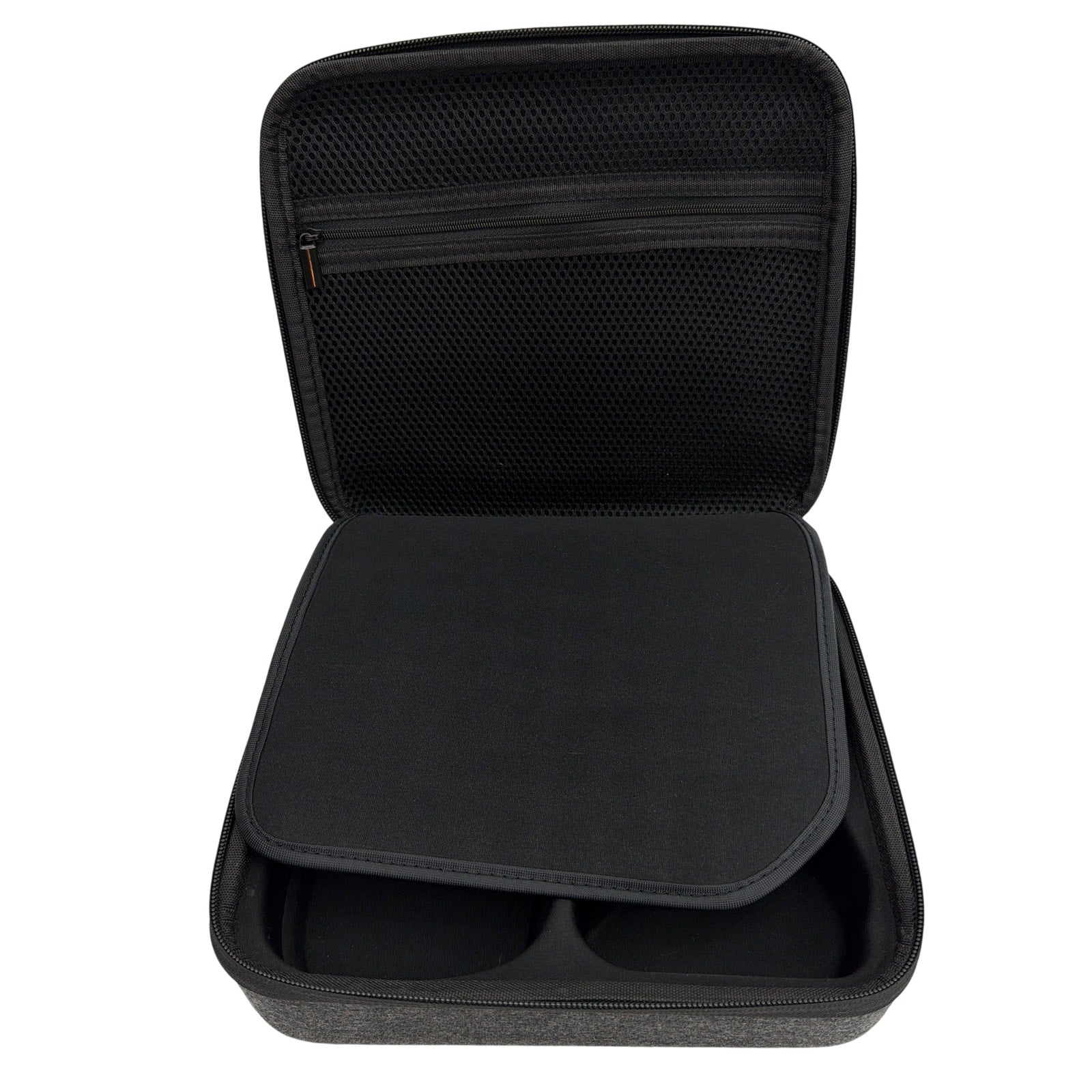 Pre-owned official Anki Cozmo hard carrying case in gray fabric with molded interior for the Cozmo robot, 3 cubes, and charger. Exterior and interior foam show minimal signs of prior use, with no obvious stains, tears, or cracks visible in photos. Zippers and handle are intact and guaranteed to be fully functional. Listing is for the carrying case only; robot, charger, cubes, and any other accessories are not included.