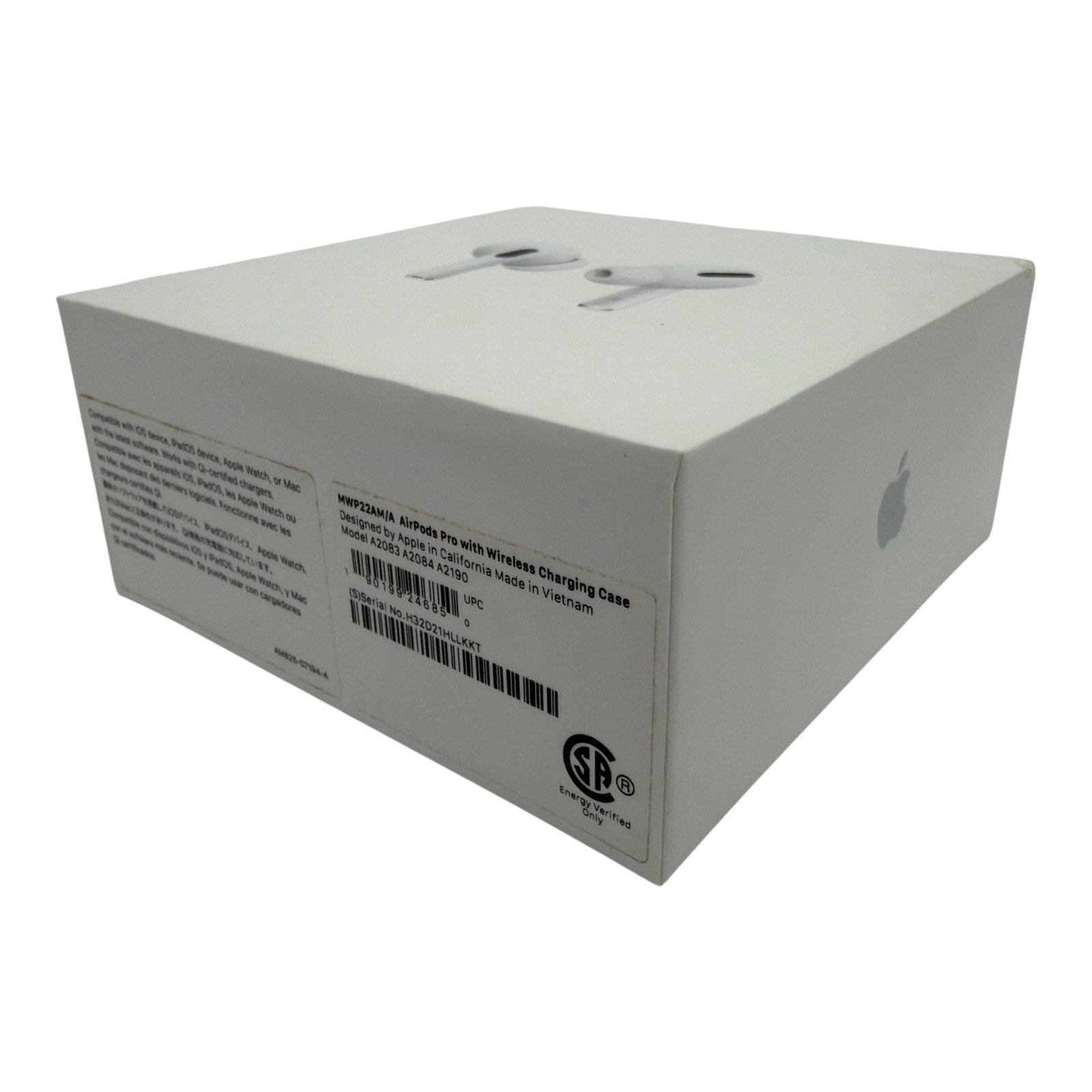 Apple AirPods Pro (1st generation) true wireless earbuds with charging case, model A2190, in white. Active noise cancelling does not work and the right earbud emits loud hits or pops when noise cancelling is enabled. Other audio and charging functions are untested and overall functionality is not guaranteed, so this set is sold strictly for parts or repair. Earbuds appear to have light cosmetic wear, while the charging case shows noticeable scratches, scuffs, and marks from use. Includes left and right earbuds, charging case, original box, documentation, and extra ear tips as shown in photos; charging cable is not included.