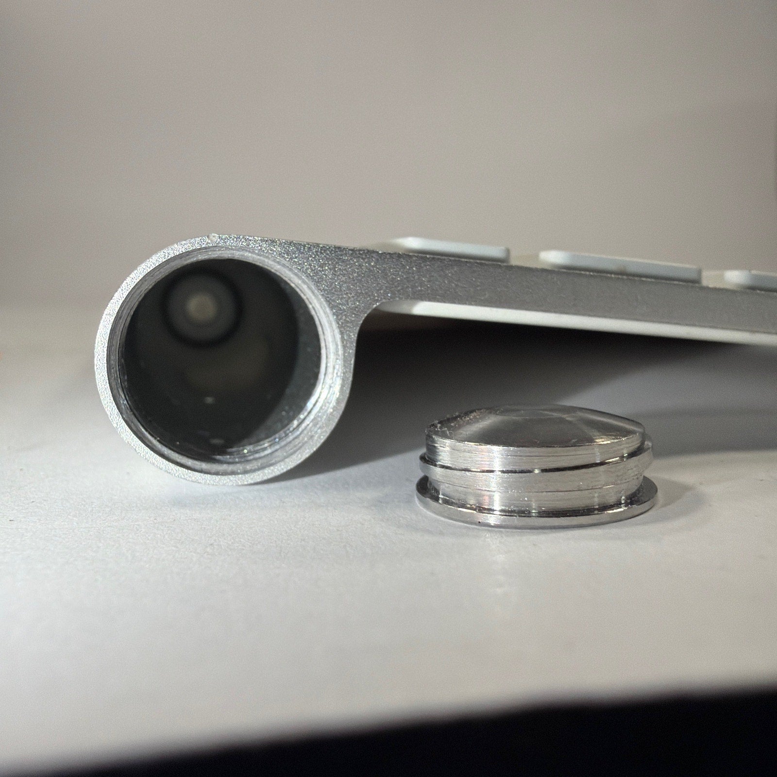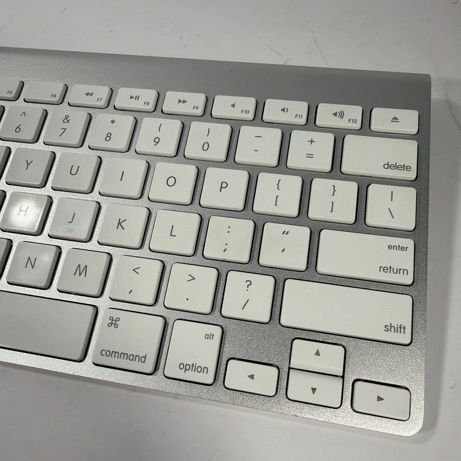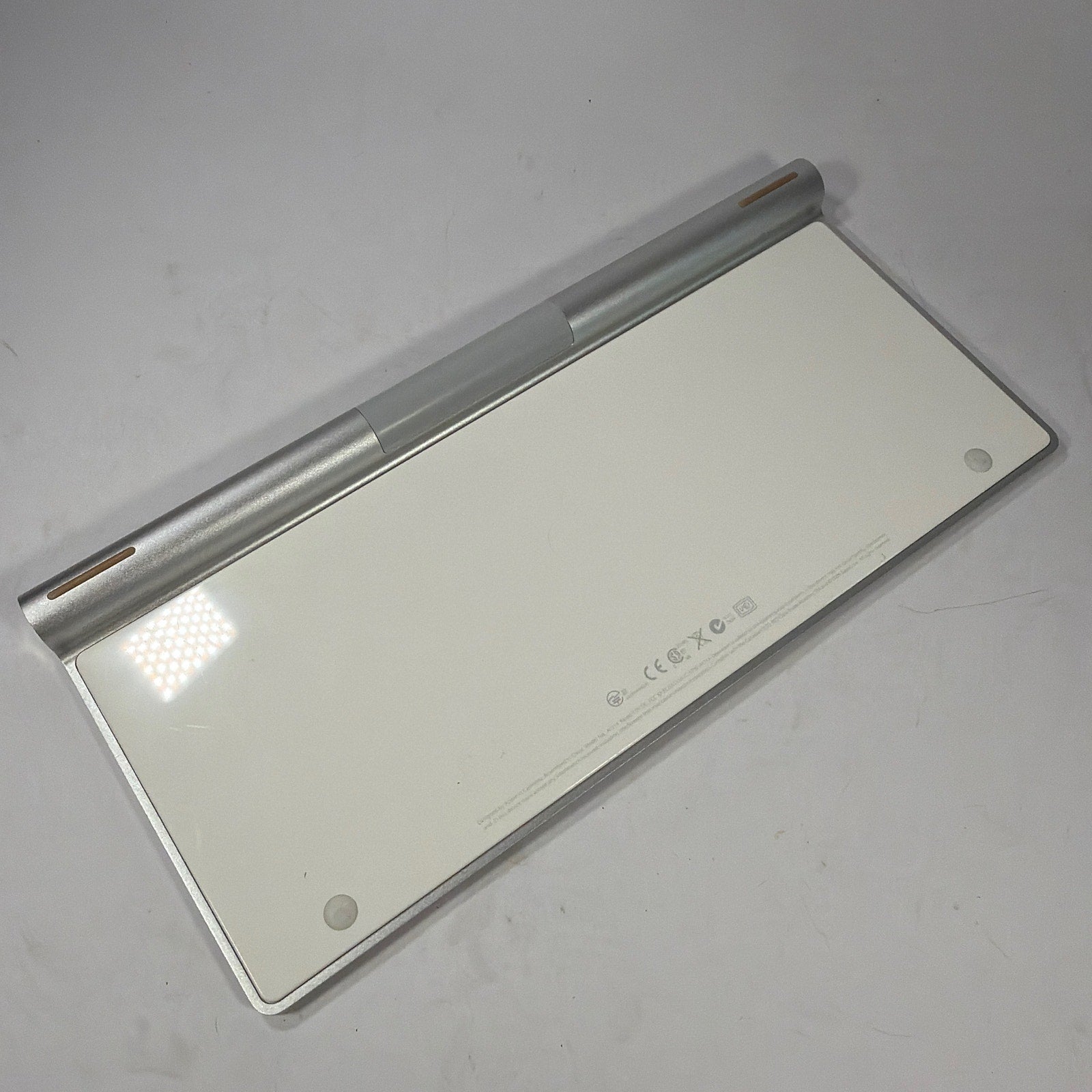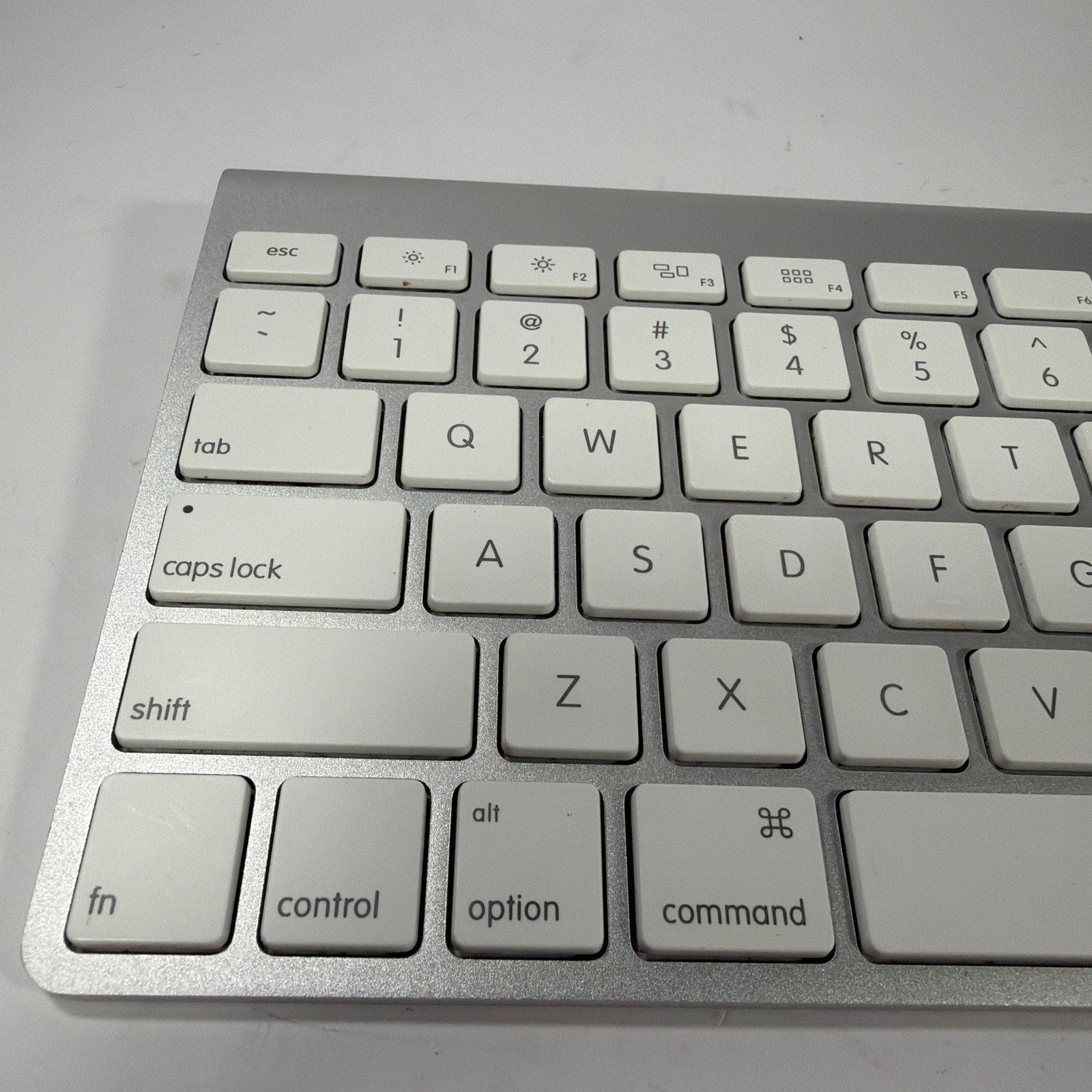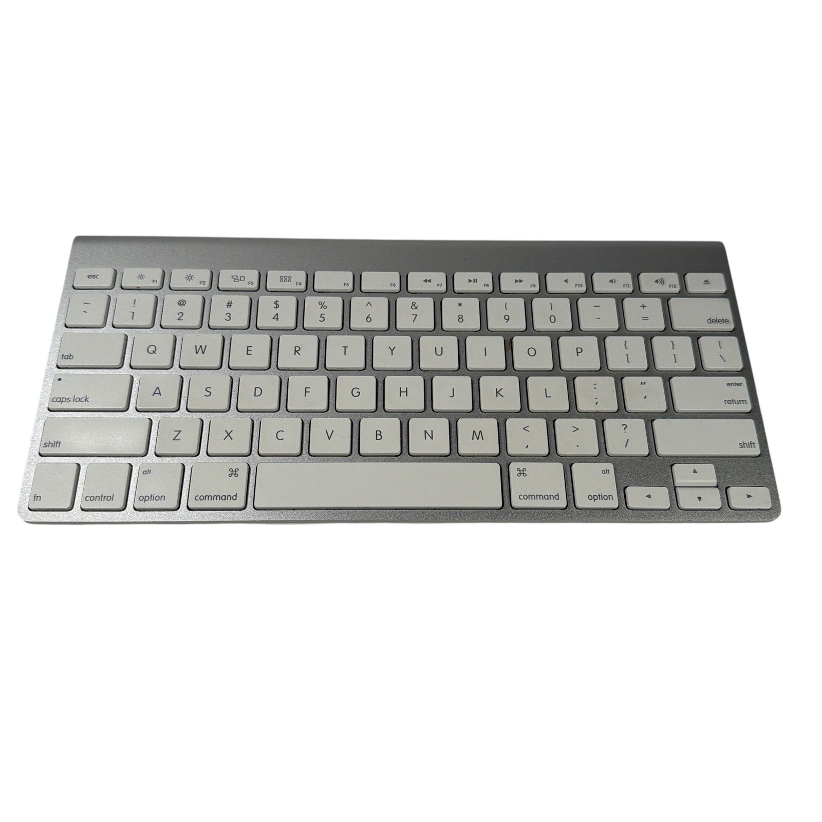 Apple wireless Bluetooth keyboard, model A1314, in silver with white keys. Tested working. Pre-owned with light to moderate cosmetic wear and small marks/scuffs from normal use. Includes keyboard and battery door/cap only.