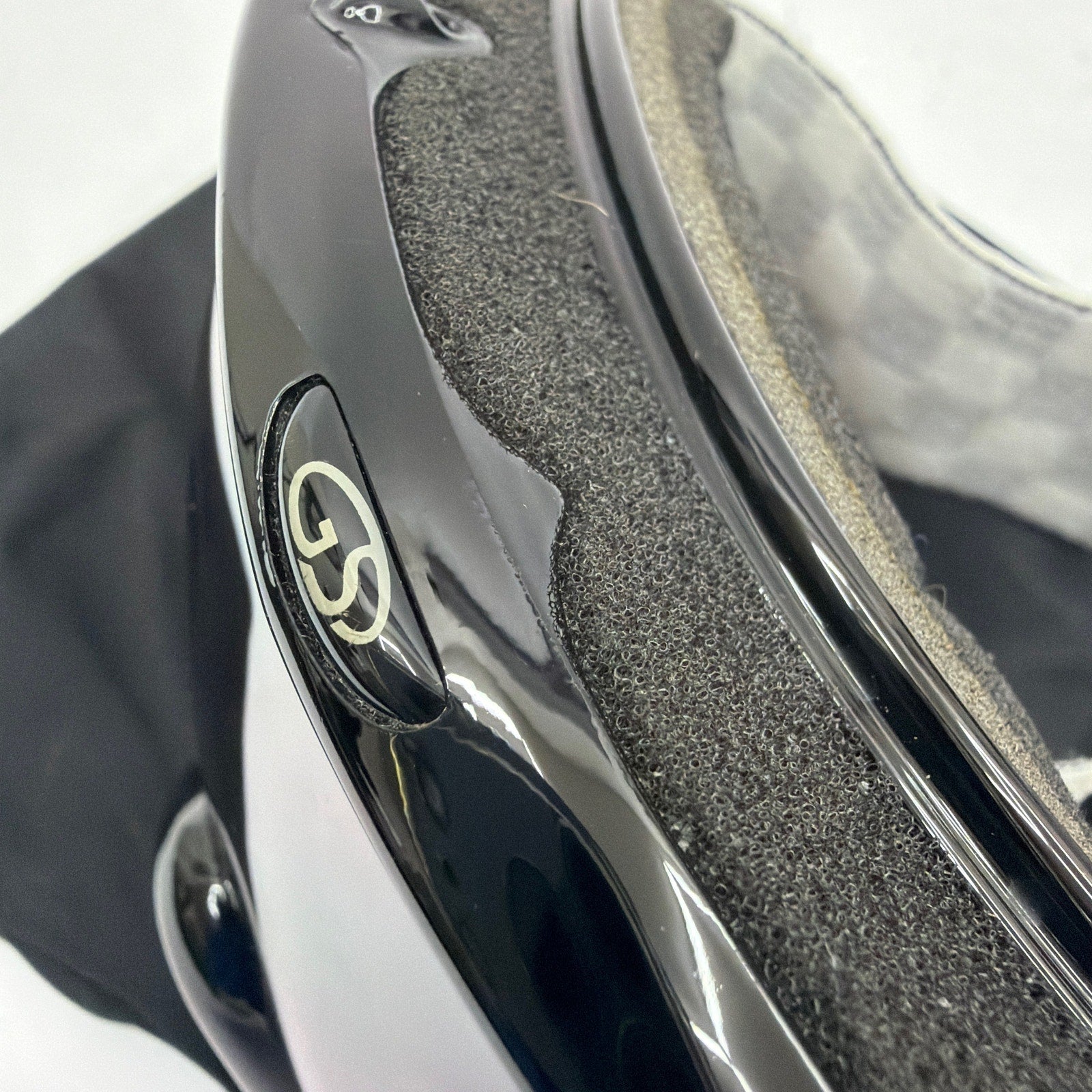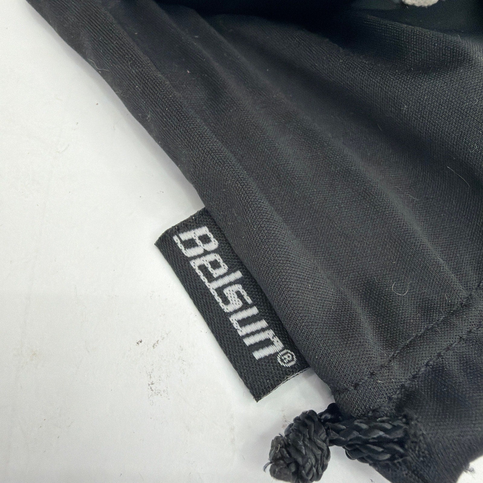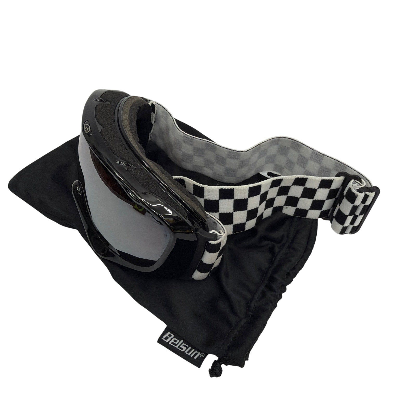 Belsun youth-size ski/snowboard goggles with a black frame, dark tinted lens, and black/white checkered strap. Includes the pictured storage pouch. Pre-owned with visible signs of use; lens and strap may have light surface marks or minor wear from handling.