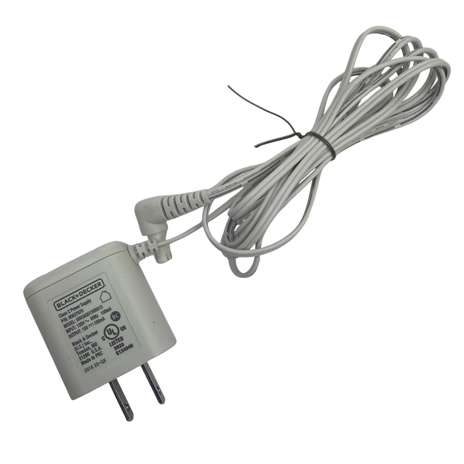 Tested working Black+Decker Class 2 power supply. Rated input: 120V~ 60Hz; output: 15V DC 150mA. Includes attached cord with the 2-pin connector shown in photos—please confirm it matches your device. Shows light cosmetic wear from normal use.