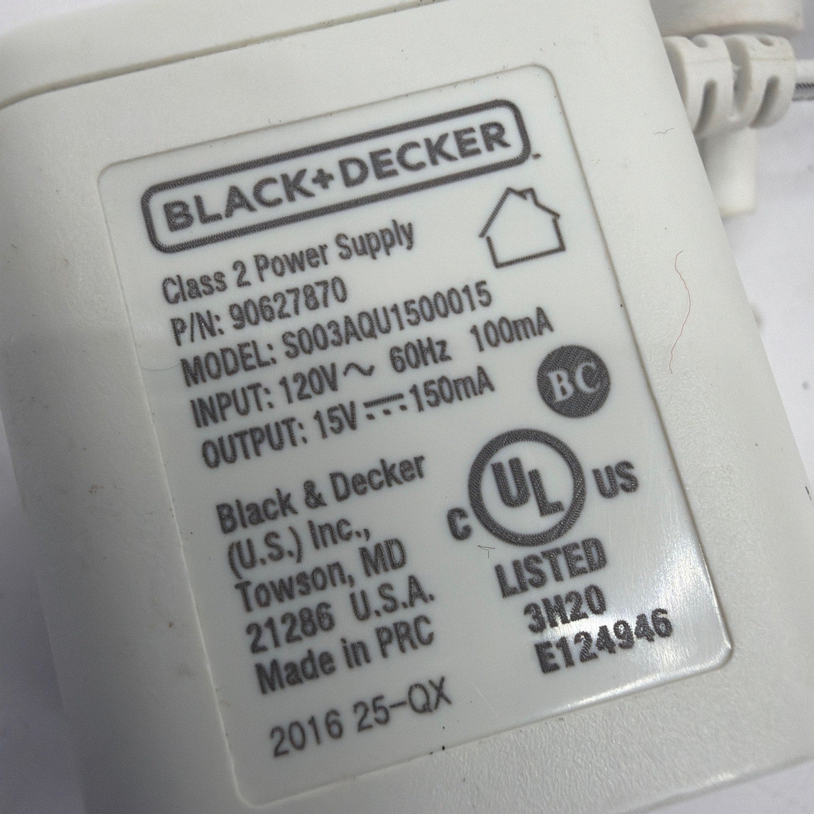 Black+Decker 15V 150mA AC Adapter Power Supply 90627870 S003AQU1500015