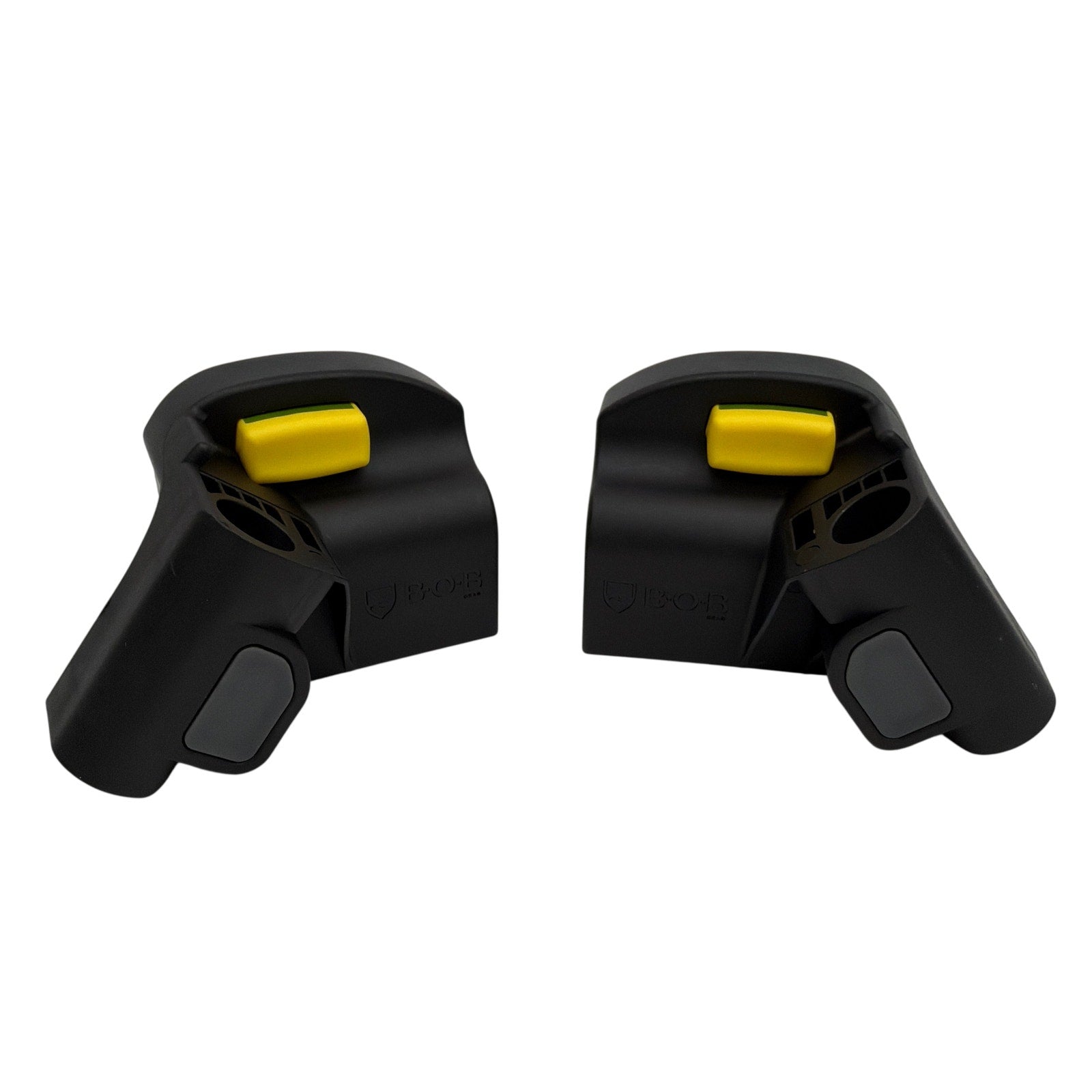 BOB Gear infant car seat adapter set with left (L) and right (R) pieces, as shown. Black with yellow release components. Appears to be in very clean condition with light cosmetic wear from handling/use. Compatibility varies by stroller and car seat model—please match the shape/markings to your setup before purchase.
