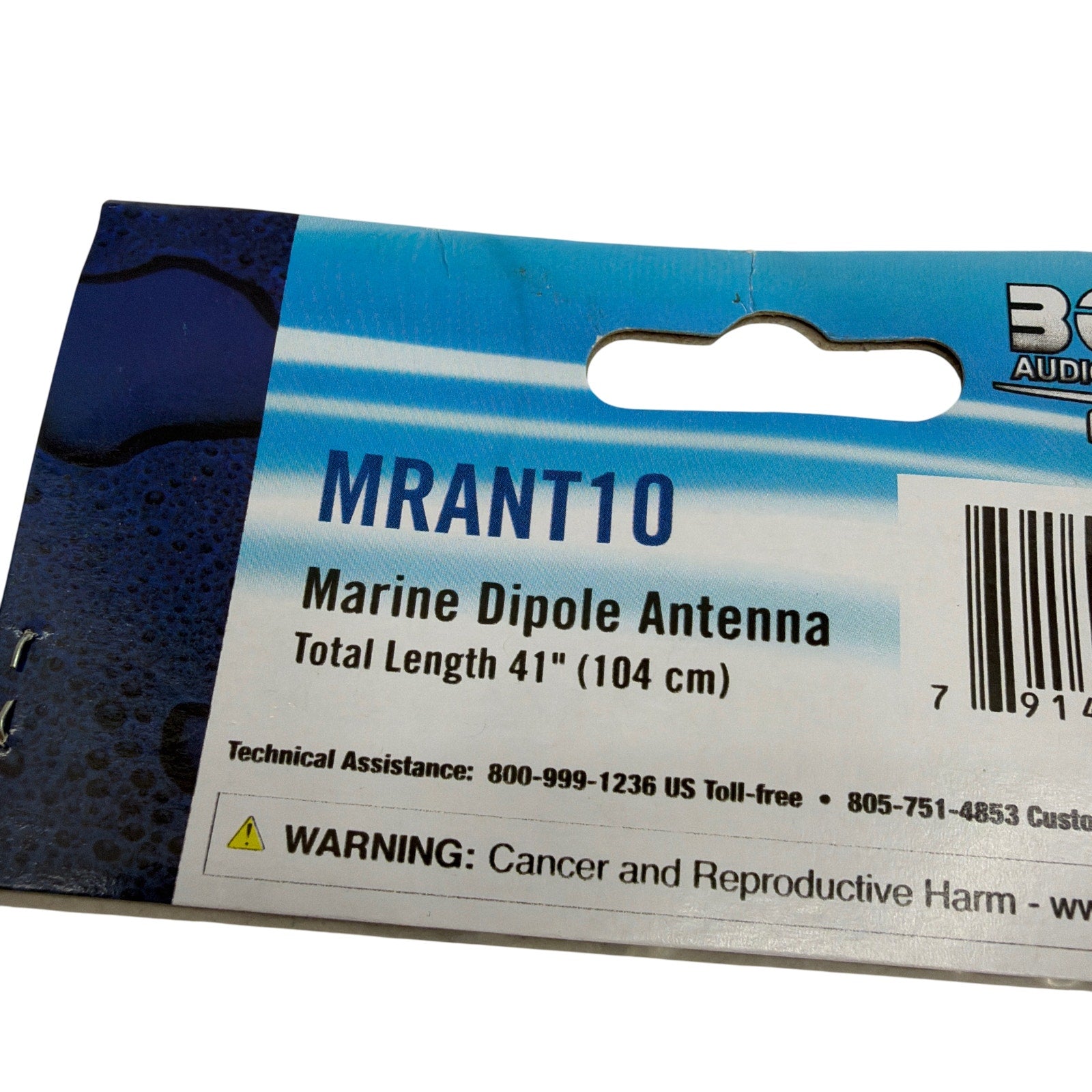 Boss Audio Systems MRANT10 marine dipole hideaway antenna, total length 41" (104 cm), black. Item is new in sealed retail packaging with some light creasing and wear on the outer plastic from storage. Includes the soft wire antenna with attached standard male antenna plug as shown, no additional accessories or documentation are included. Guaranteed to be fully functional.