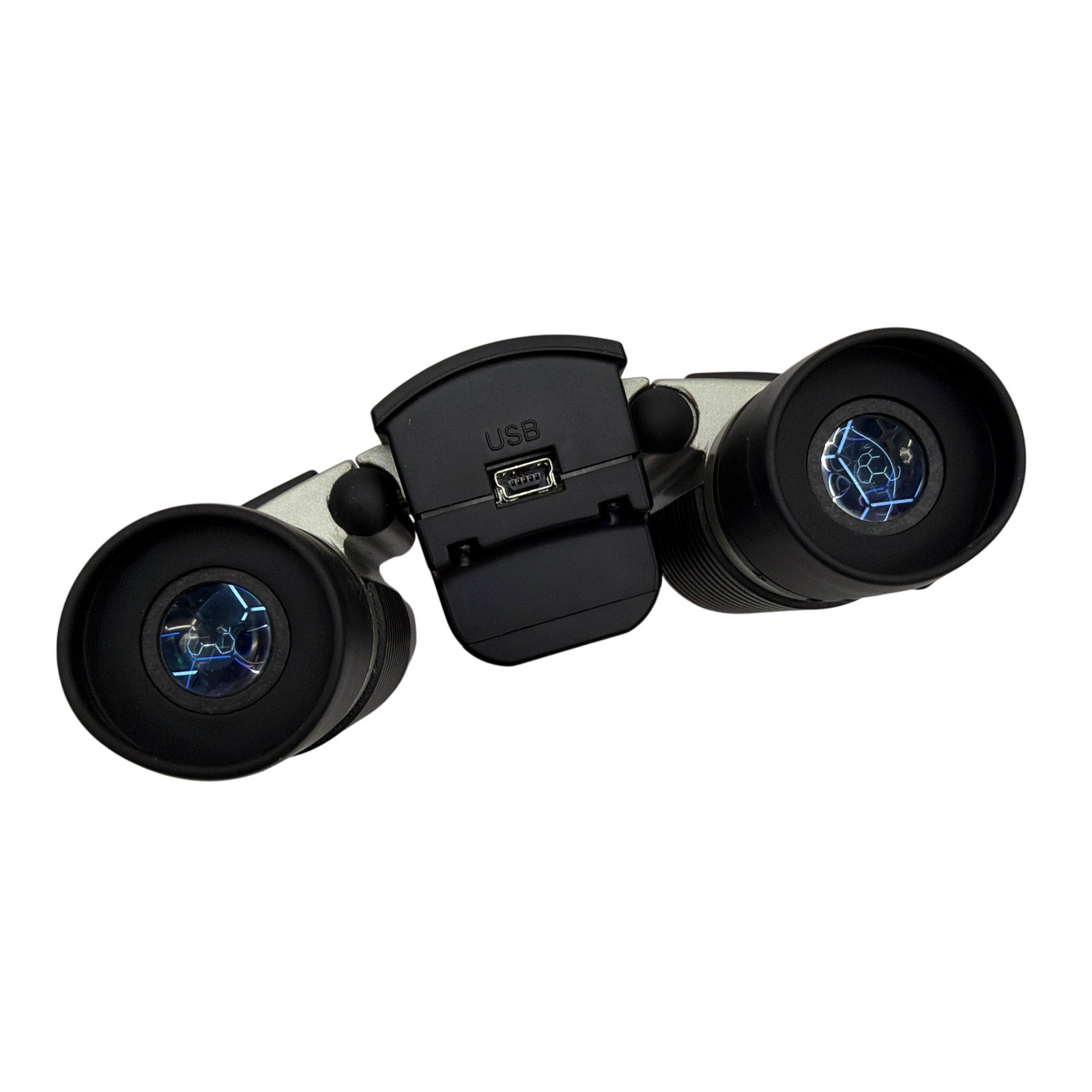 Bushnell digital binoculars with built-in LCD display and USB port. Unit is non-working and reportedly powers off when connected to a PC. LCD screen shows significant display bleed/damage as shown. Includes the Bushnell soft carry case only; batteries and any cables are not included.