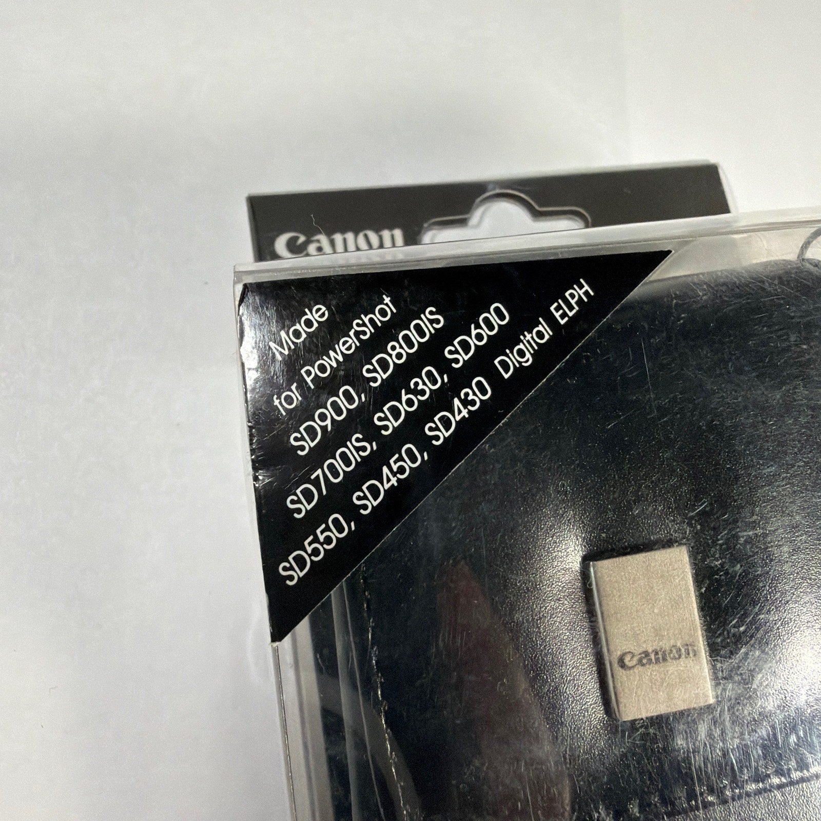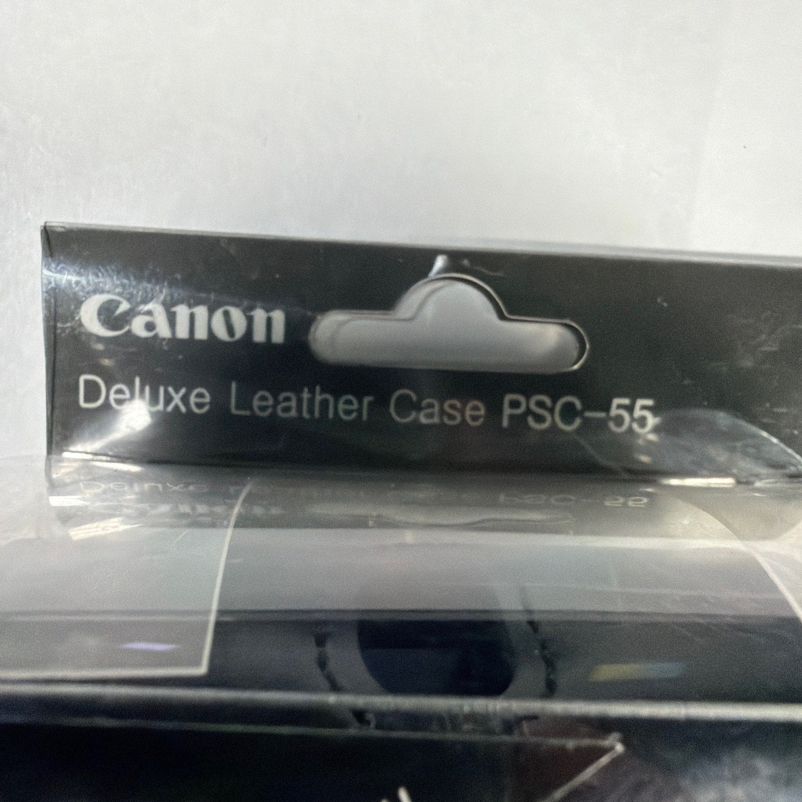 Genuine Canon PSC-55 deluxe leather camera case in black for select PowerShot Digital ELPH/SD series cameras. Includes the leather case and Canon wrist strap; original retail packaging is included but shows noticeable scuffing/creasing from storage. Case is new otherwise.