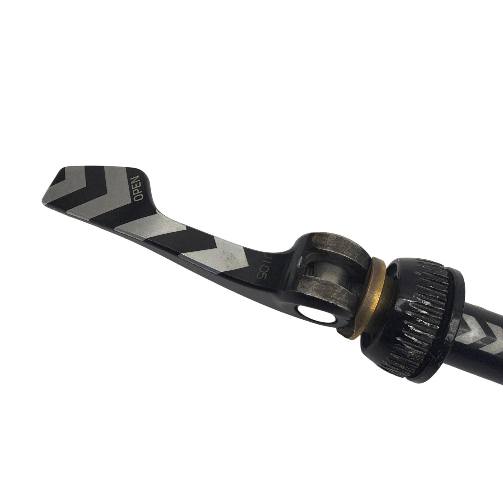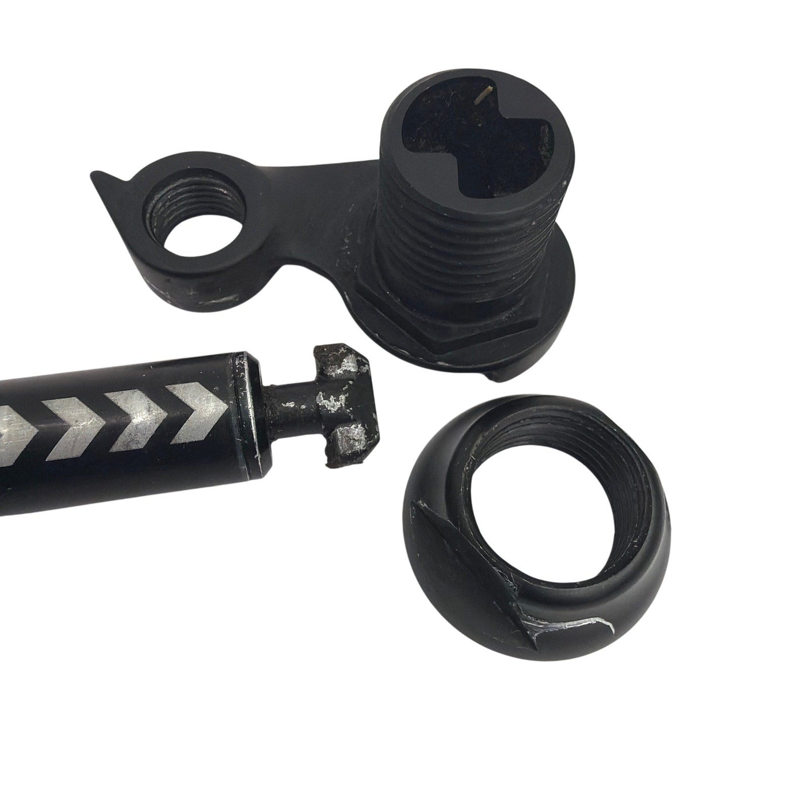 Cervelo R.A.T. (Rapid Axle Technology) rear 12mm thru-axle marked 155.7mm. Includes the axle with lever plus the CVR18 hanger/axle-nut pieces shown in the photos. Pre-owned with visible scuffs and finish wear, especially on the lever and hardware; threads and contact surfaces may also show wear from prior installation.