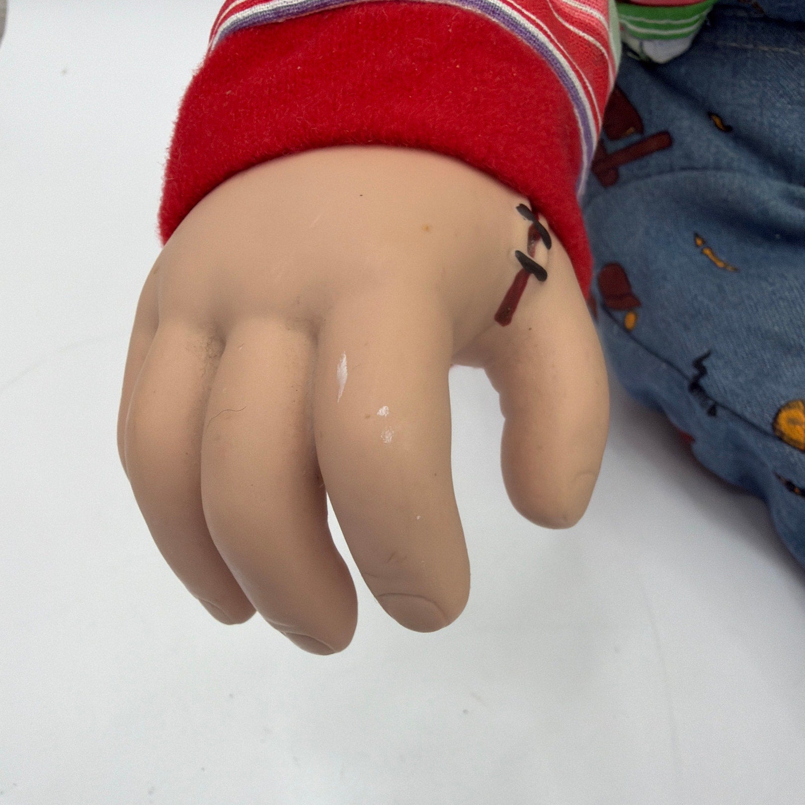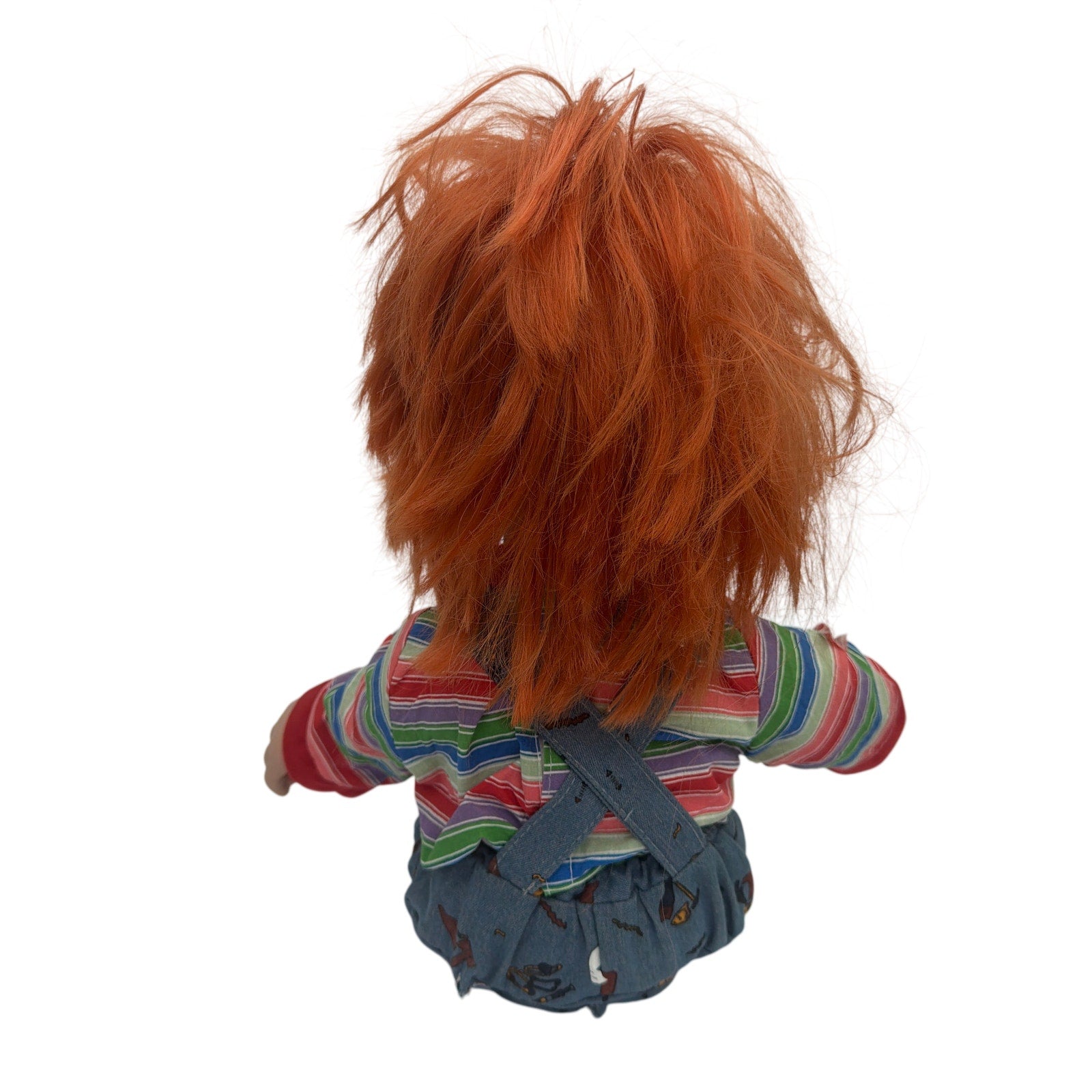 Battery-operated Chucky “Good Guys” doll; measures about 15" from butt to head when sitting (about 12" butt to toe). Tested and working: speaks, with moving mouth and left-hand motion. Pre-owned condition with noticeable wear that may include fraying/holes on the outfit, scuffs/paint wear on the shoes, and messy hair (see photos). Doll only; batteries not included. No knife.