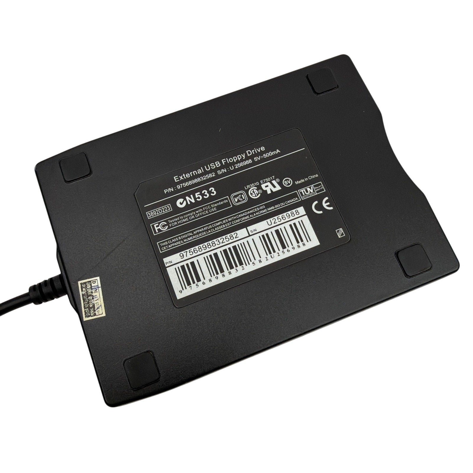 External USB floppy drive, model CN533. Tested working. Pre-owned with light cosmetic wear such as minor scuffs from normal use. Includes the floppy drive with attached USB cable only.