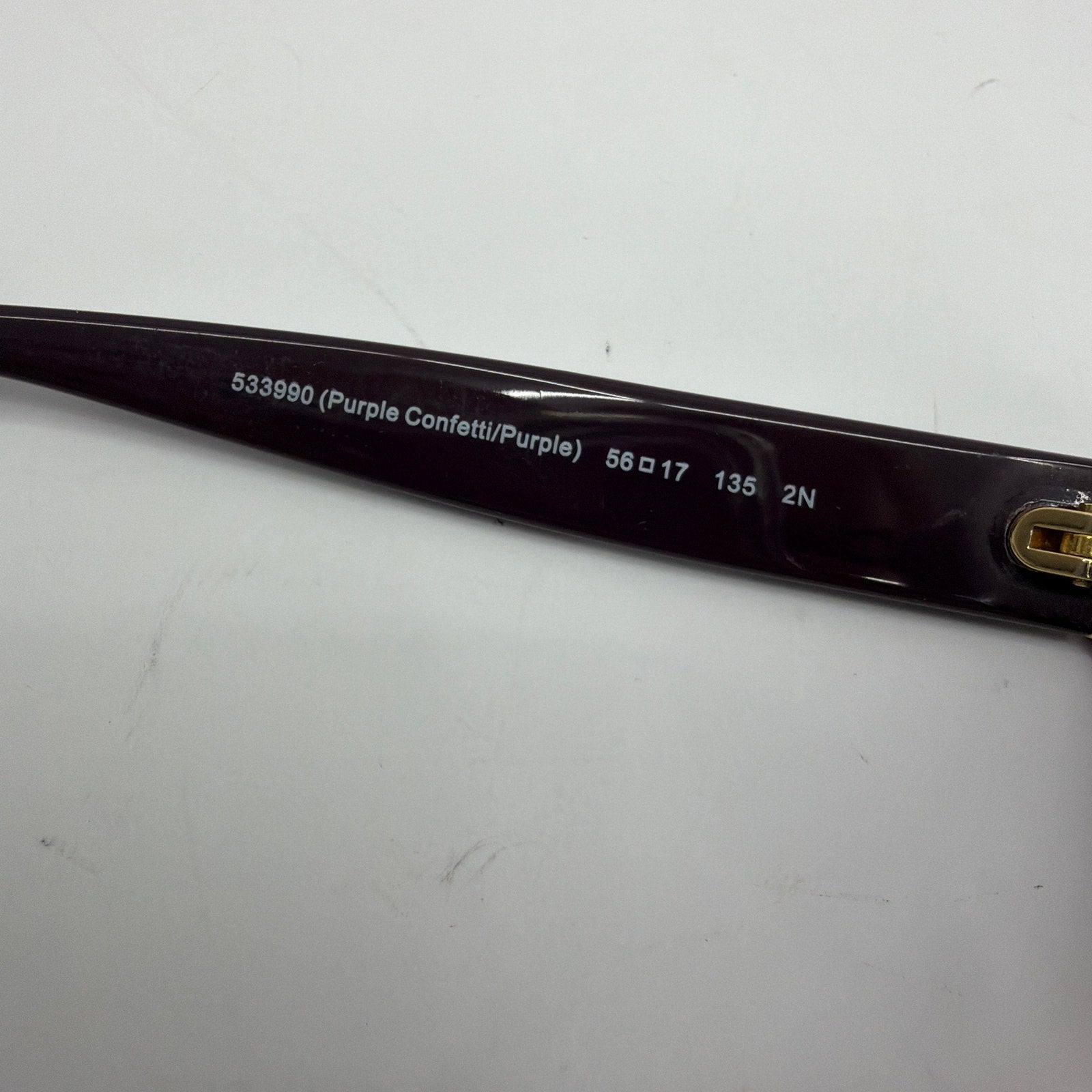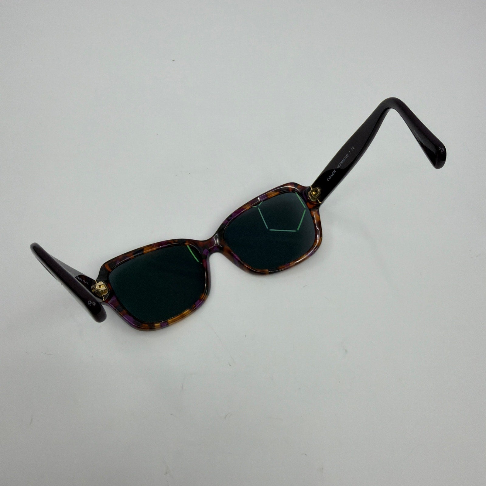 Coach HC8160 (L145) sunglasses frame in the Purple Confetti/Purple colorway, size 56-17-135. Includes prescription lenses that show noticeable scratching and will likely need replacement. Frame shows light cosmetic wear from normal use. No case or additional accessories included.