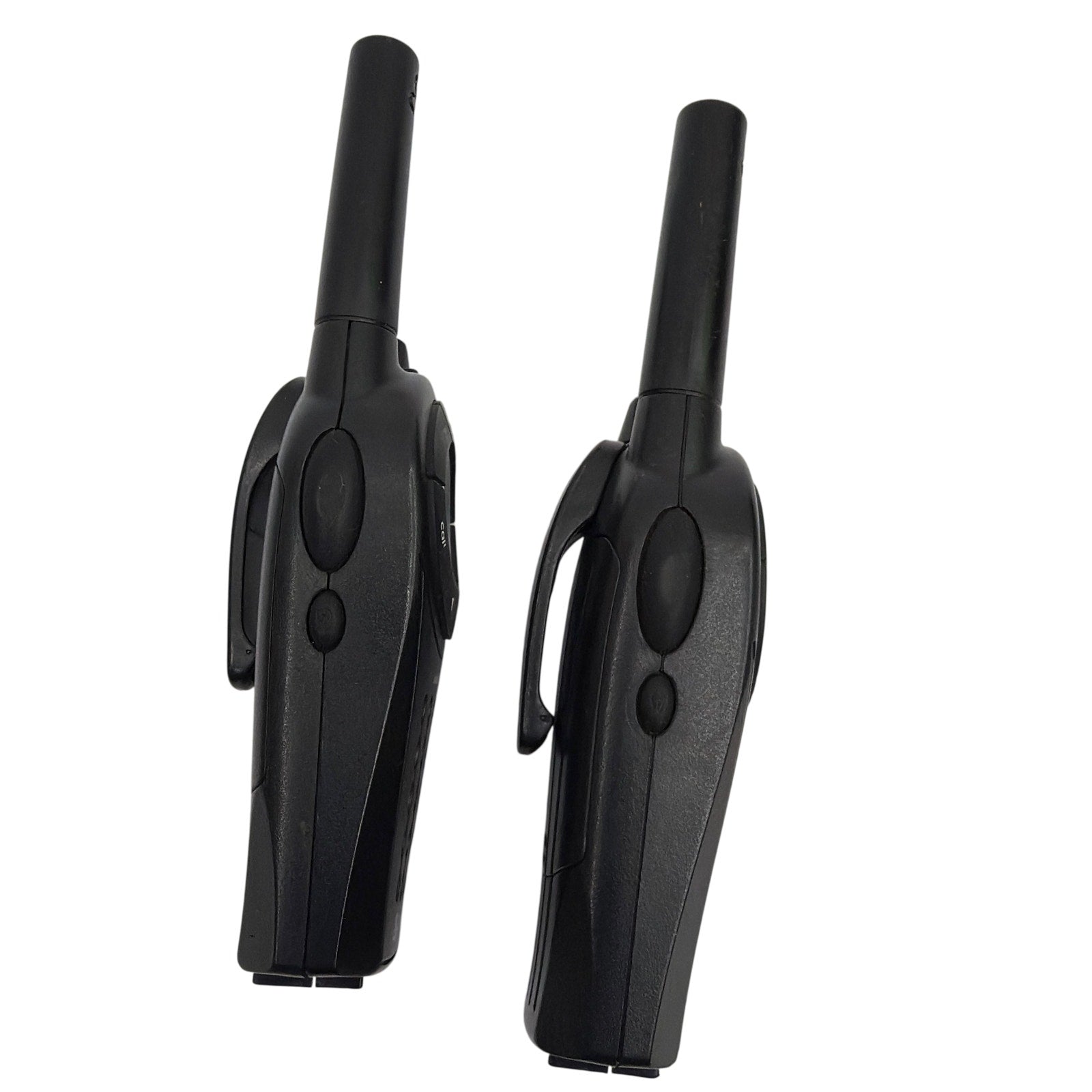 Cobra microTALK PR3850 handheld two-way radios, tested working. Pre-owned with light to moderate cosmetic wear such as scuffs and surface marks from use. Includes 2 radios and 2 belt clips with battery covers as shown; batteries and any other accessories are not included.