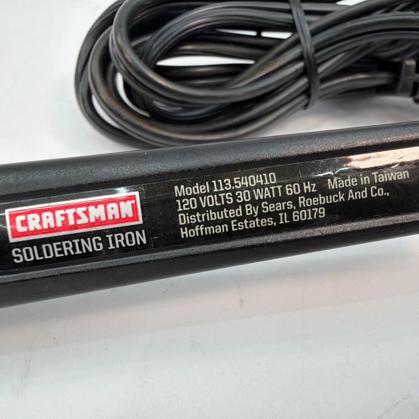 Craftsman corded soldering iron, model 113.540410 (120V, 30W, 60Hz). Tested working. Pre-owned with visible cosmetic wear and oxidation/solder residue on the tip from prior use. Includes the soldering iron with attached power cord and plug only; no stand or extra tips are included.