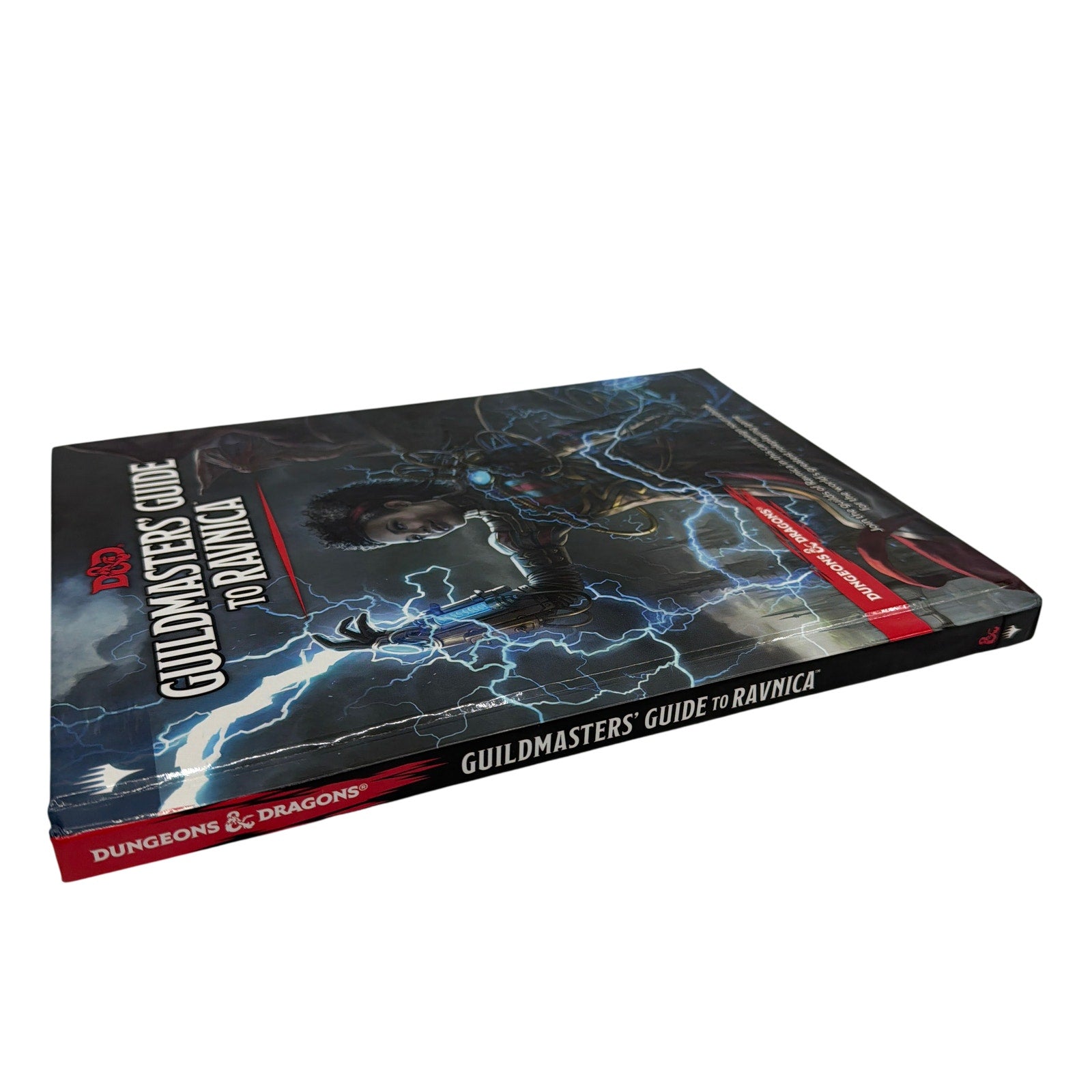 Hardcover copy of Dungeons & Dragons 5th Edition Guildmasters' Guide to Ravnica by Wizards of the Coast. Cover shows light shelf wear with minor edge/corner wear and some surface scuffing/wrinkling to the outer wrap that may be from storage. No additional accessories are included—book only.