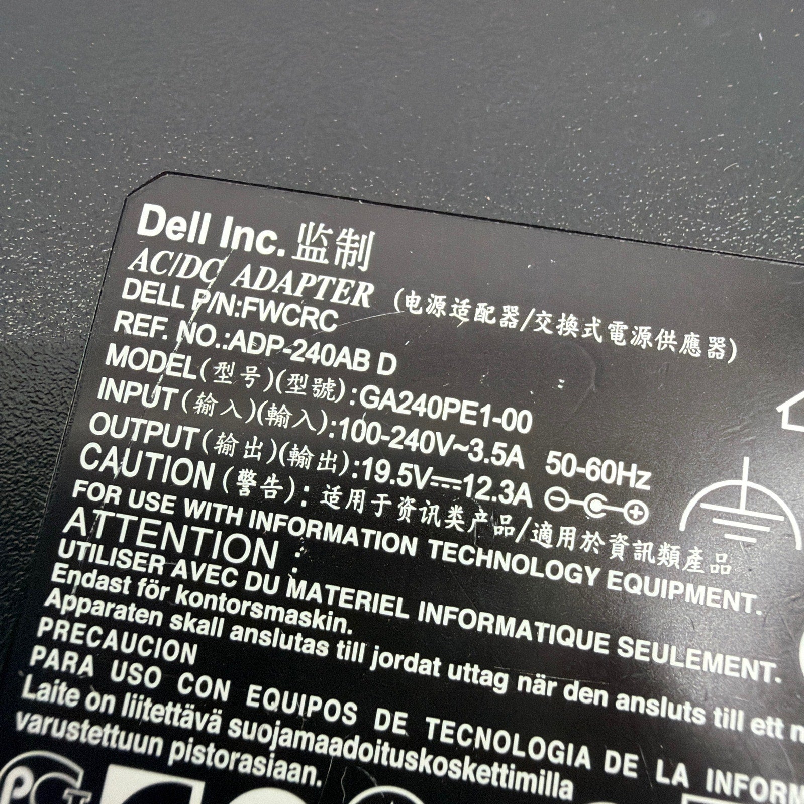 Dell 240W AC/DC power adapter, tested working (Model GA240PE1-00 / Dell P/N FWCRC). Includes the adapter with attached DC cable and the AC power cord shown. May show light cosmetic wear from normal use, including scuffs on the housing and connector. Output rating: 19.5V 12.3A (240W); confirm compatibility with your device before purchase.