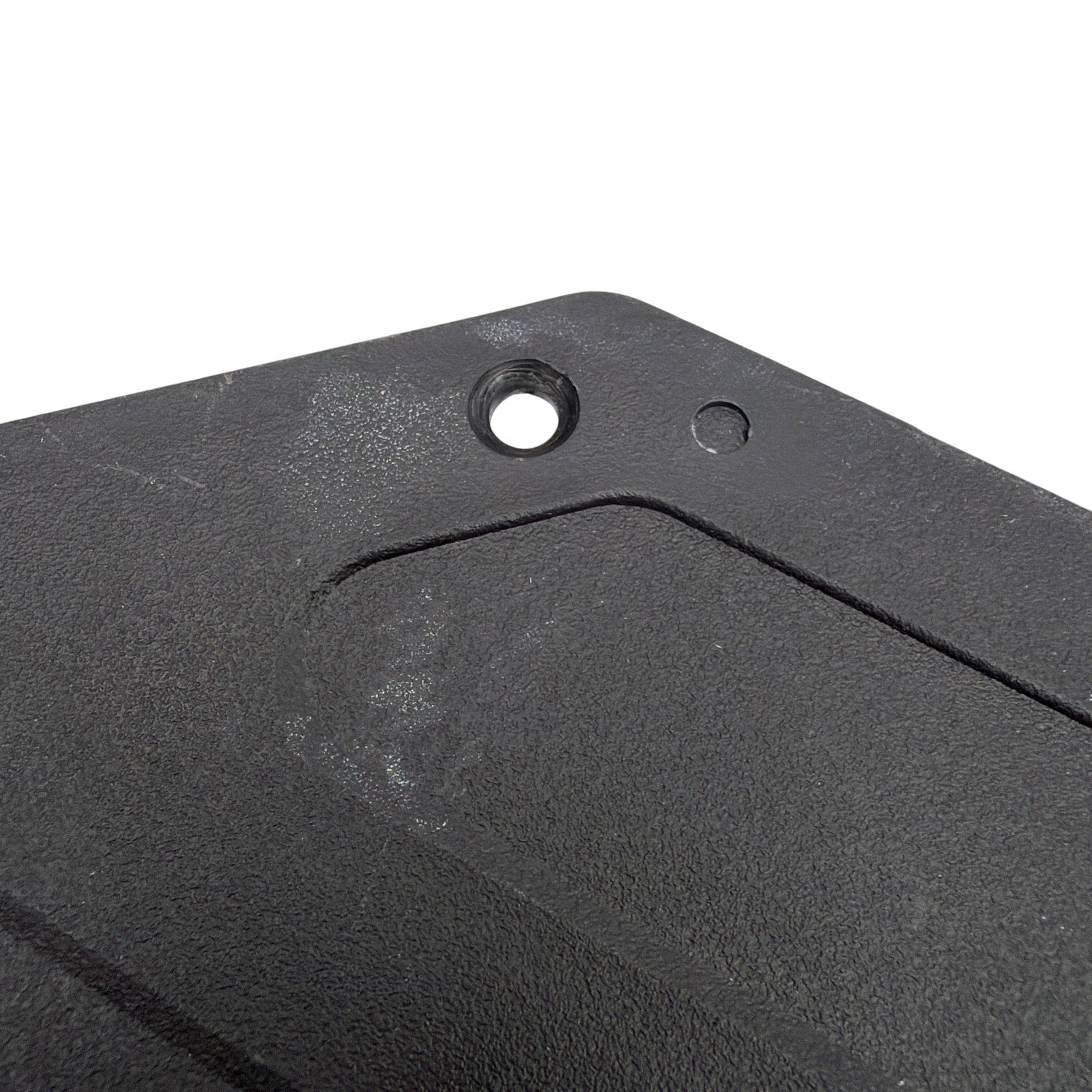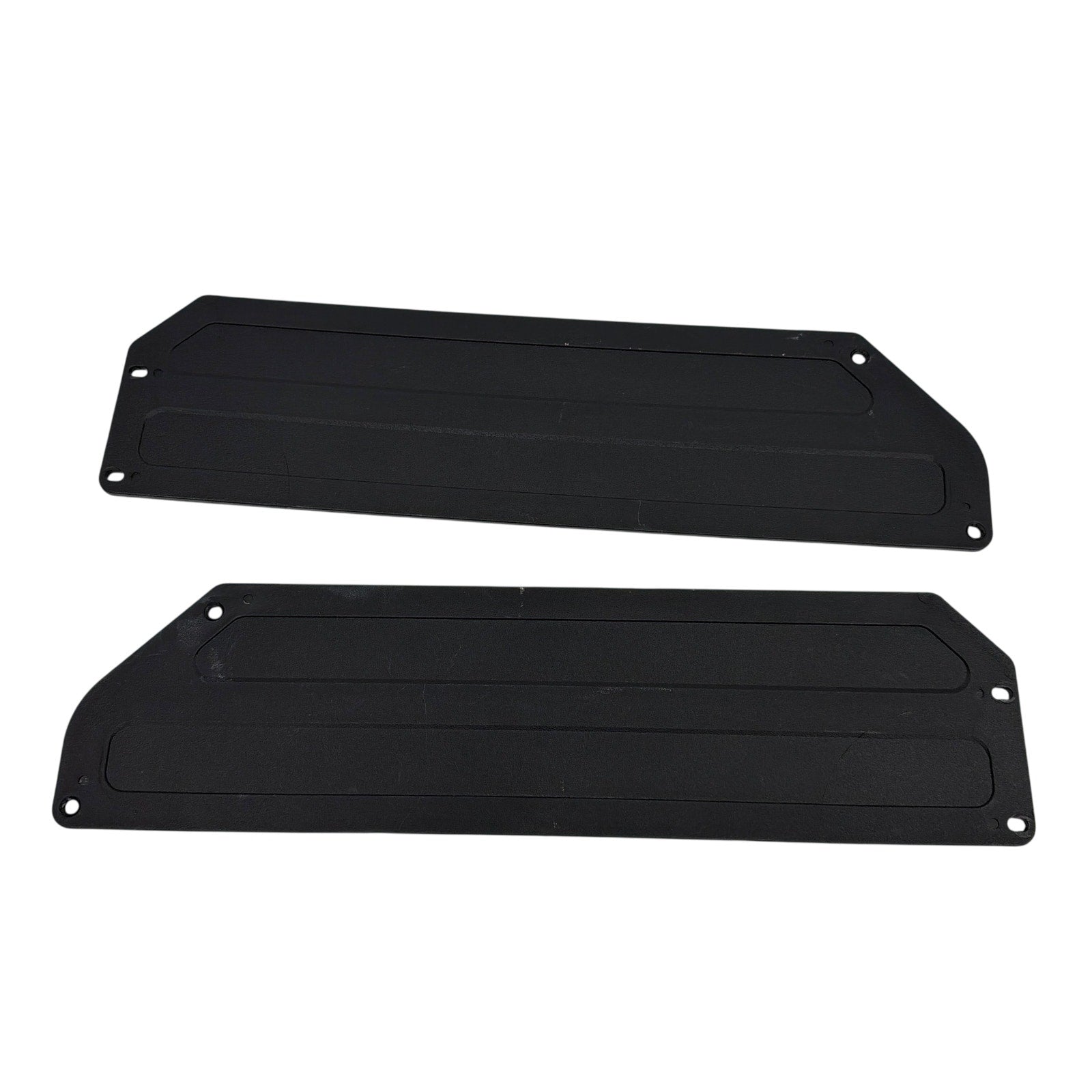 Set of two black plastic side cover plates from Drive Medical, each with pre-drilled mounting holes and Drive logo. Items show moderate cosmetic wear including surface scuffs, light scratches, and wear around some mounting holes as shown in photos, but they remain structurally sound. Mounting hardware is not included. Please verify compatibility. Roughly17.5" long by 4.5" tall.