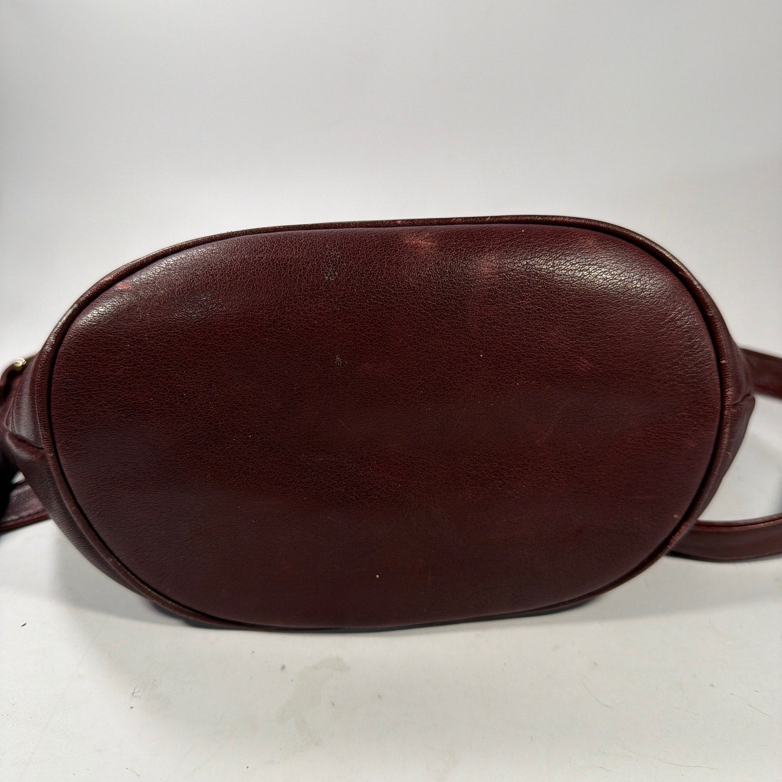 Etienne Aigner genuine leather hobo/shoulder bag in dark burgundy with embossed horseshoe logo and top zip closure. Approx. 10 x 6 x 10 in. Pre-owned with visible creasing and wear/scuffing, most noticeable along the bottom and piping; hardware may show light wear. Includes attached adjustable shoulder strap; no other accessories are included.