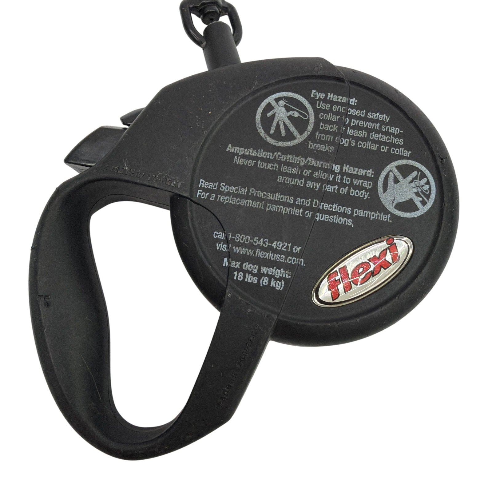 Flexi retractable cord dog leash in black, labeled for dogs up to 18 lb (8 kg). Pre-owned with noticeable scuffs/scratches and general wear. The plastic near the swivel/attachment area shows damage; see photos. Includes only the leash shown.