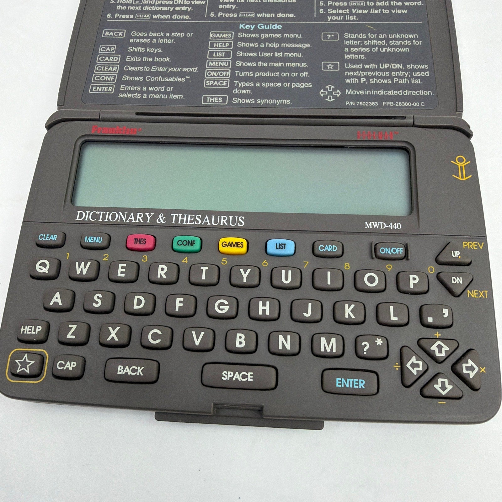 Franklin Bookman electronic dictionary & thesaurus, model MWD-440. Tested working, with new batteries installed. Shows normal cosmetic wear from use, including light scuffs and surface marks. Includes handheld unit only.