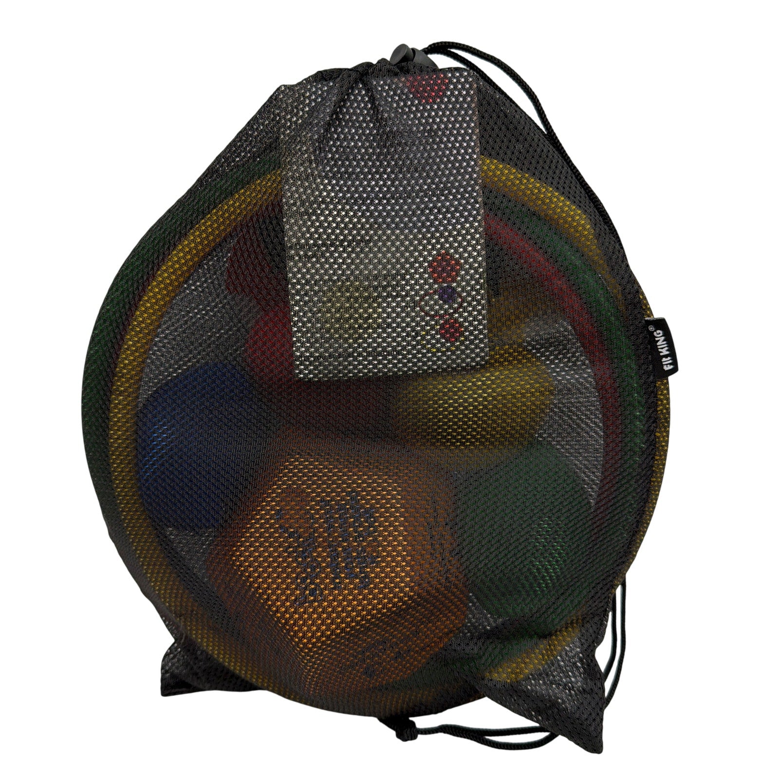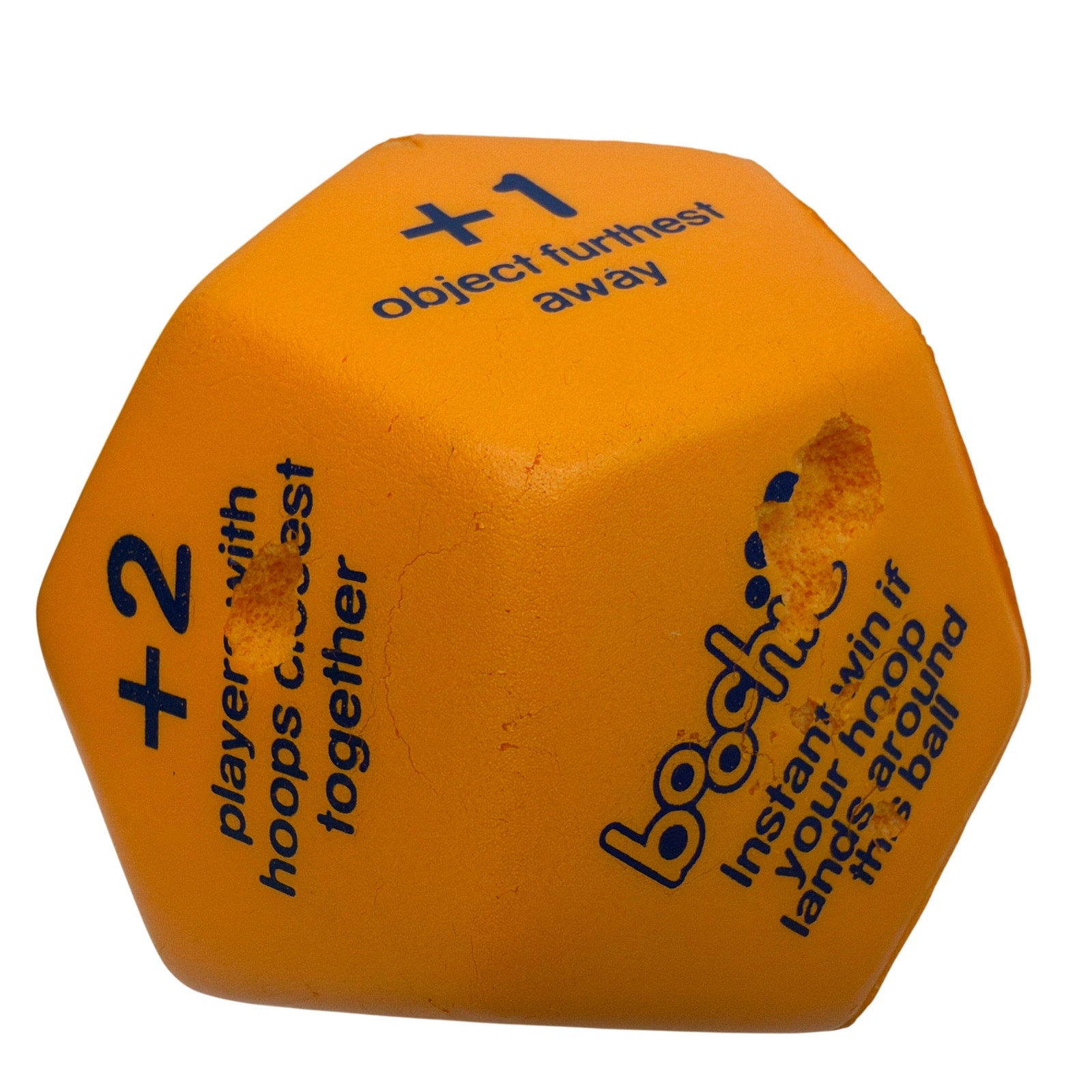 Pre-owned Gamewright Boochie “A Whole New Ball Game” dexterity set, appears complete with 4 bean balls, 4 toss rings, 4 wrist trackers, 12-sided Boochie ball, mesh travel bag, and rules sheet as shown. All components show noticeable cosmetic wear from prior use, including scuffs and marks on the balls and rings, discoloration and surface wear on the orange Boochie ball, and a visible seam split/tear on the blue bean ball. The mesh bag and wrist trackers show light wear but remain intact. Set is guaranteed to be fully functional, though buyers should review photos carefully for condition details before purchase.