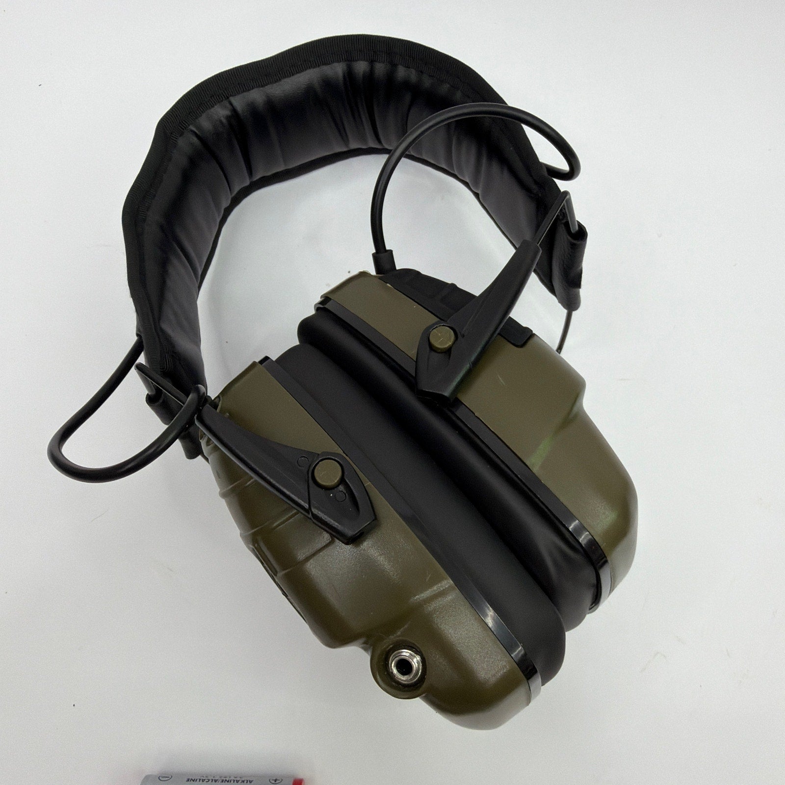 GLORYFIRE electronic hearing protection earmuffs in olive green and black. Pre-owned with light cosmetic wear such as minor scuffs/marks; padding may show slight use. Uses two AAA batteries (not included). Includes earmuffs only; no original box or additional accessories are included. Tested working.