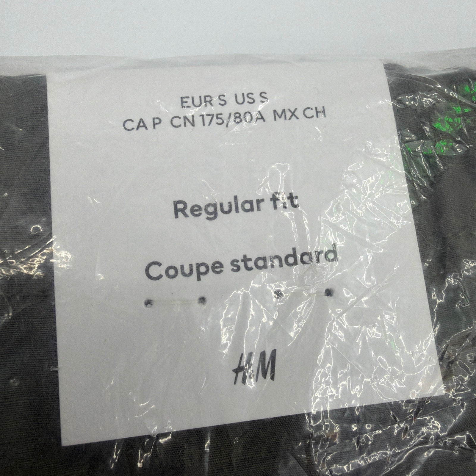 H&M regular fit pants in dark green, size US S. Item appears new and sealed in the original plastic packaging; packaging may show minor handling wear. Inseam is not listed—please refer to measurements if needed.