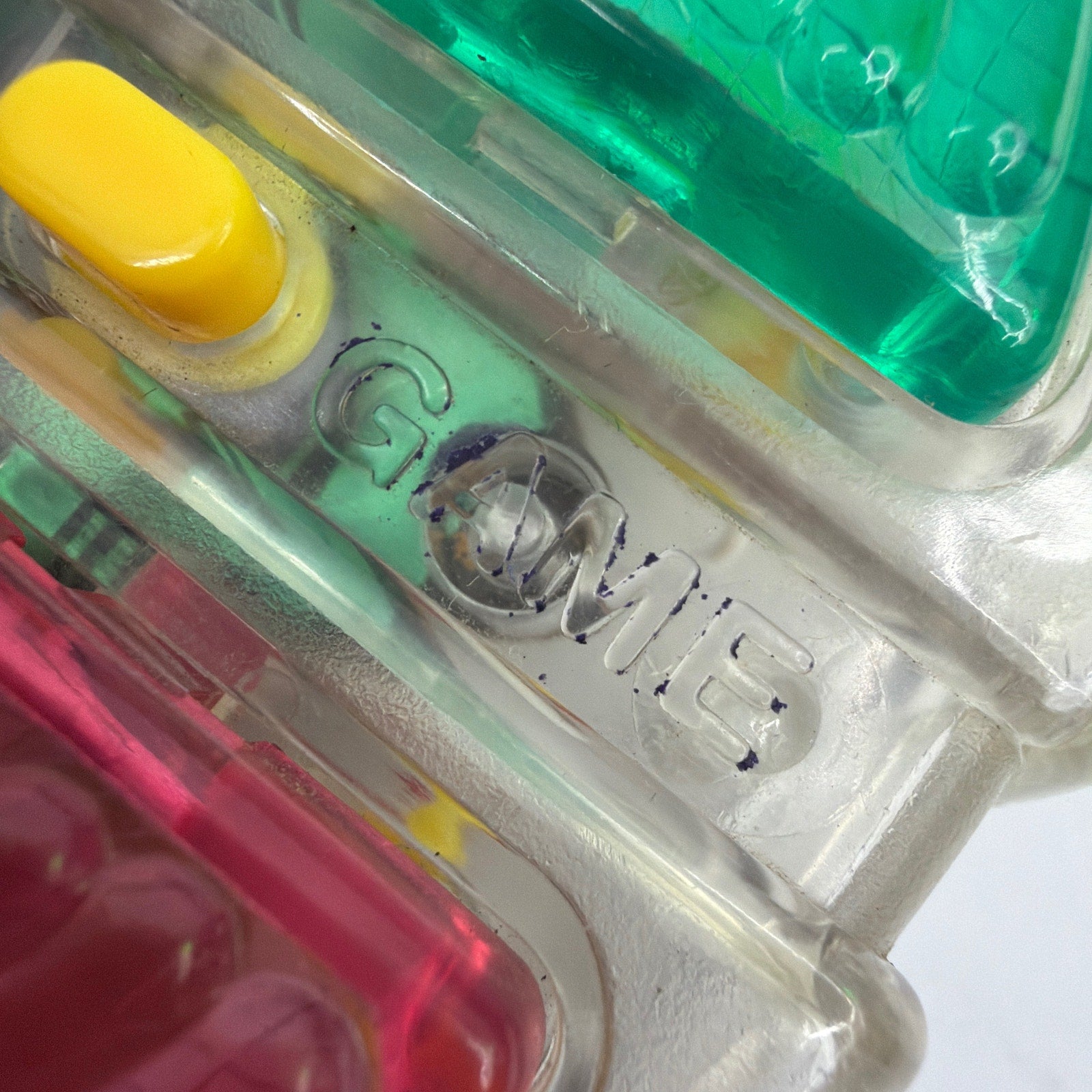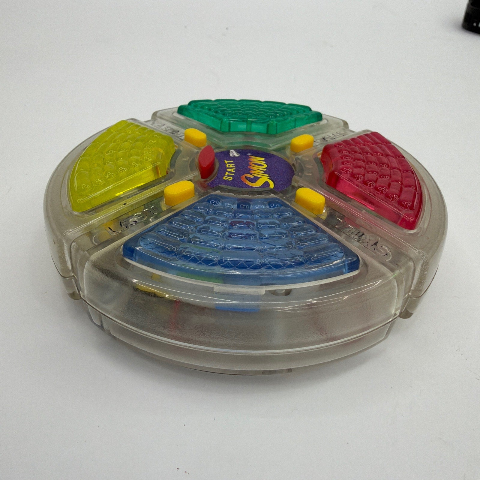 Hasbro Simon electronic memory game with clear/translucent housing (game unit only). Tested working. Cosmetic wear from use, including scuffs/scratches, some cloudiness/yellowing, and ink/marker marks on the plastic. Requires batteries (not included).