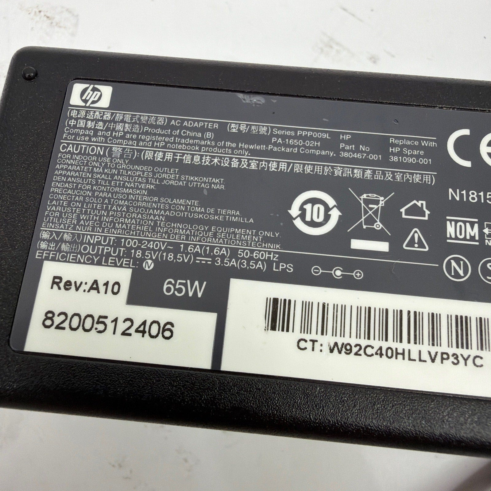 HP 65W AC adapter power supply, model PA-1650-02H (Series PPP009L). Tested working. Includes the AC power cord shown. Adapter casing and cables may show minor cosmetic wear from normal use.