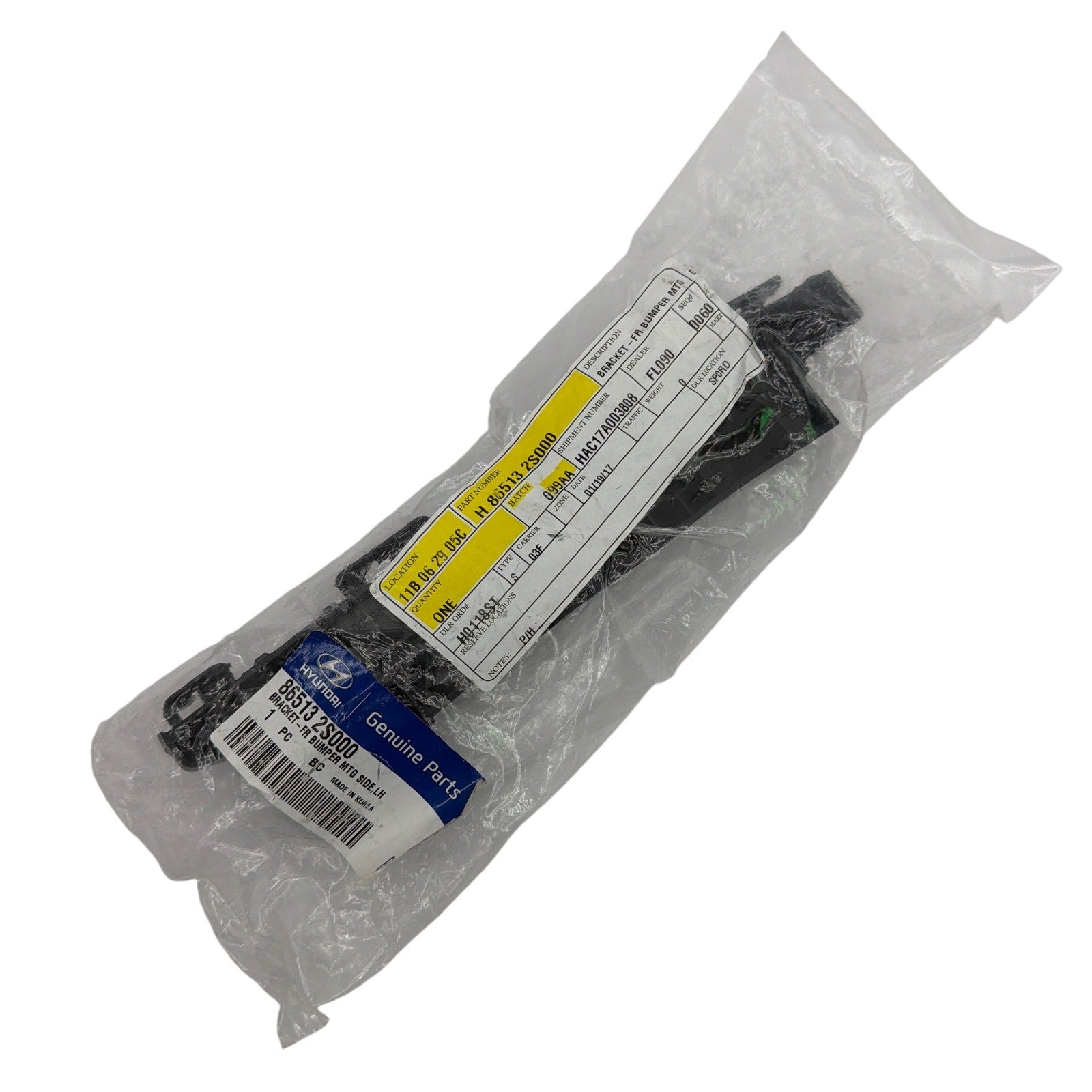 Genuine Hyundai front bumper mounting side bracket, left-hand (driver side), part number 86513-2S000. New old stock in the original Hyundai plastic packaging, which shows some creasing and minor marks from storage. Bracket itself appears unused and is guaranteed to be fully functional. Buyers should verify compatibility with their specific vehicle before purchase.