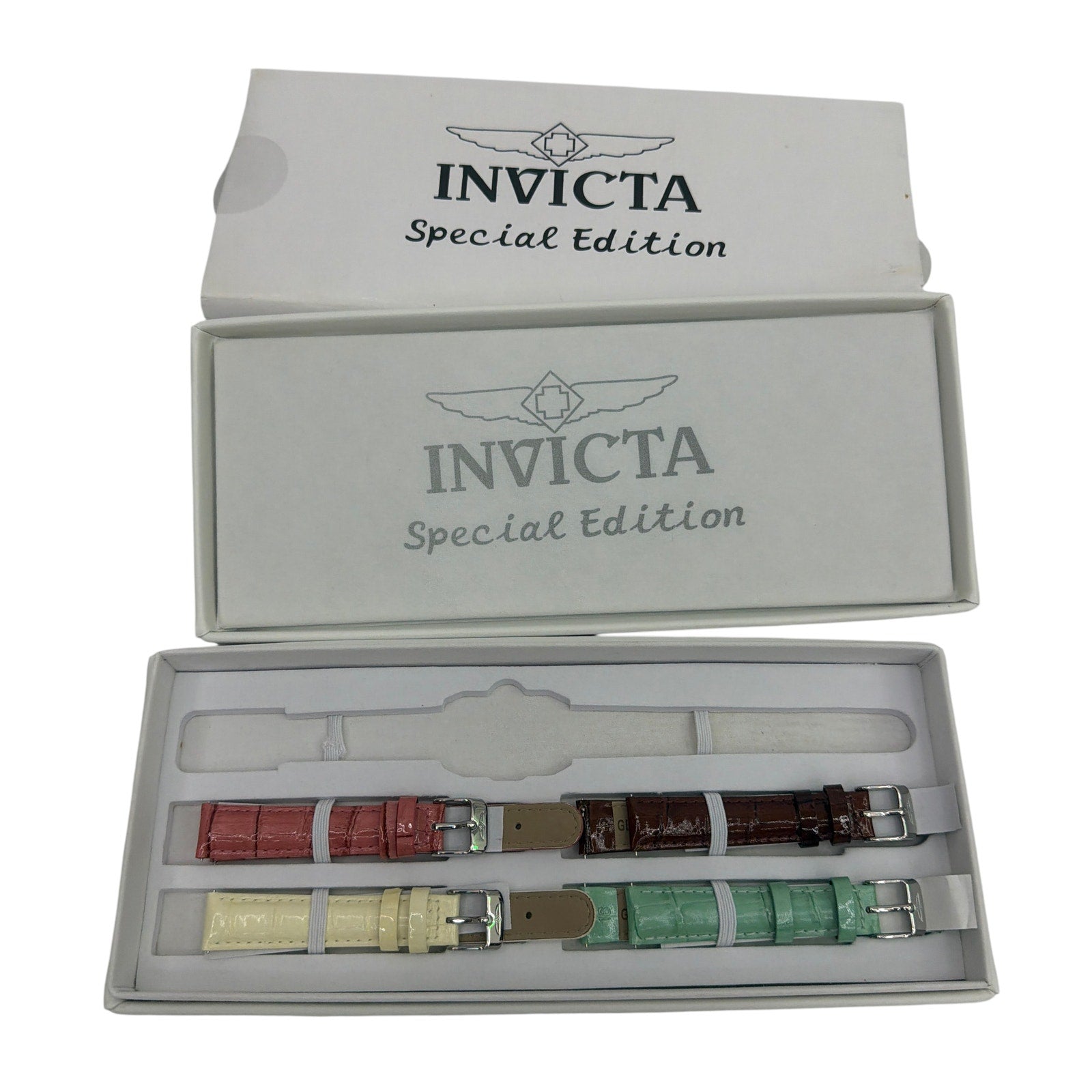 Invicta Special Edition replacement wristwatch band set for model 5168. Includes four genuine leather two-piece straps in pink, cream, brown, and green, each with buckle and spring bars attached. No watch head/case is included—bands and box only. Bands appear unused, but the outer box and inner insert may show minor storage wear or light discoloration.