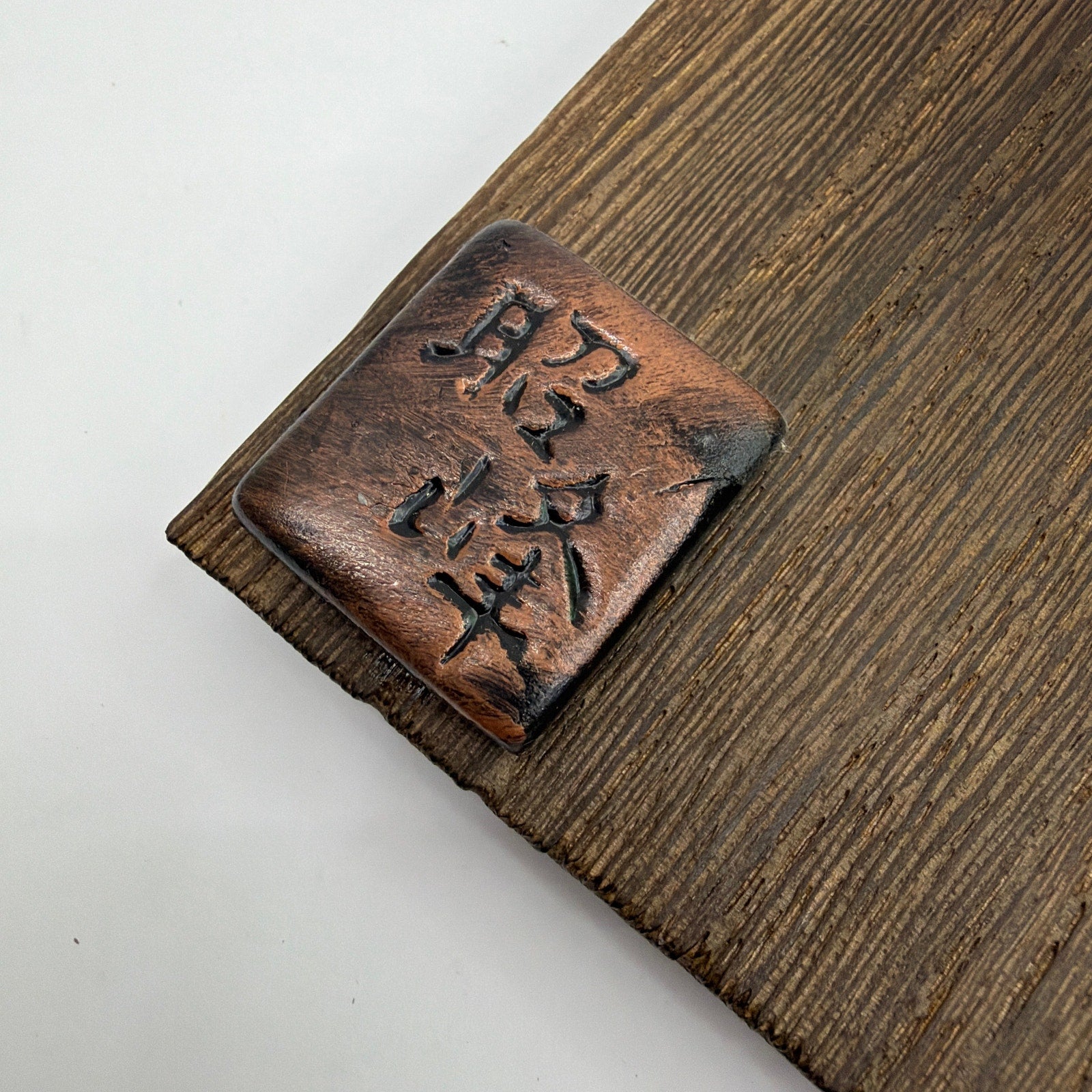 Japanese-style Hyottoko character mask mounted to a wooden backing board with hanging cord. Pre-owned with visible wear, including scuffs/marks to the mask surface and finish wear to the wood. Purple side ties are present as shown. No maker information confirmed; included items are only what is pictured.
