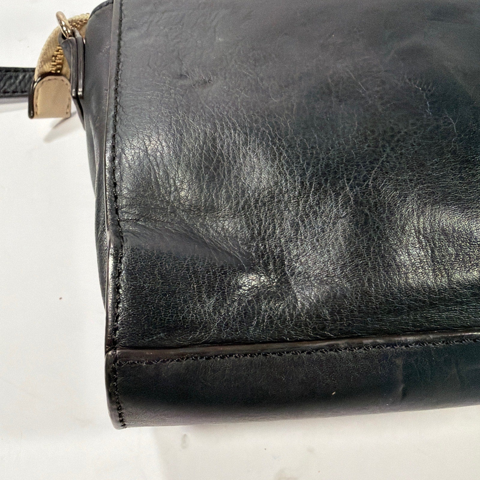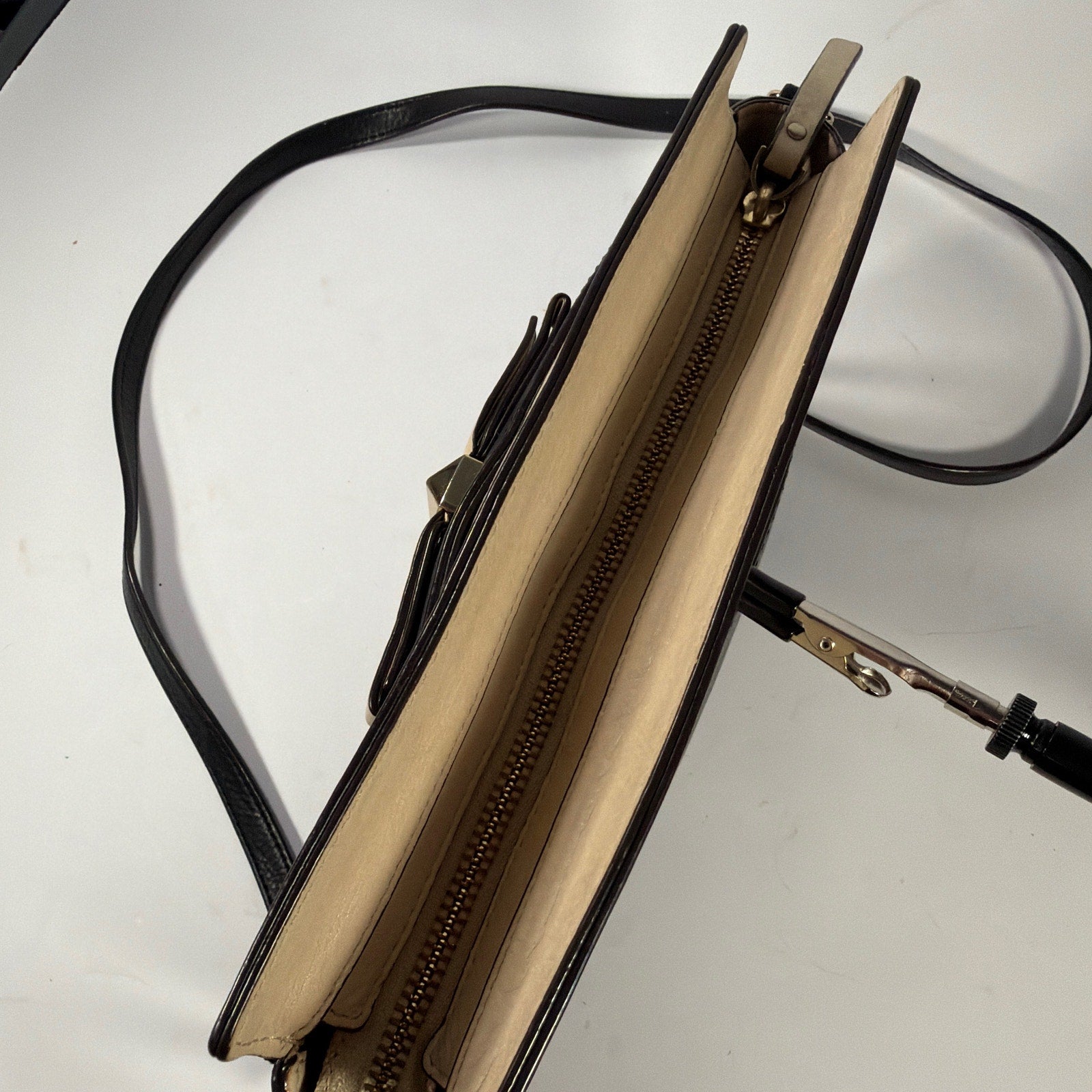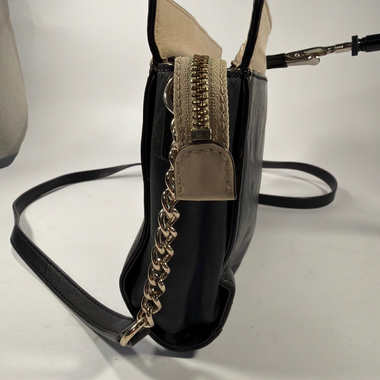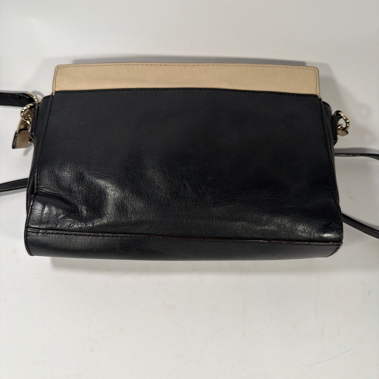 Kate Spade New York leather crossbody bag in black with a cream top trim and gold-tone bow accent. Approx. 10 x 2 x 7 in. Pre-owned with visible wear, including creasing/scuffs to the leather, wear/discoloration on the lighter leather, and noticeable wear on the zipper tape; interior may show light signs of use. Includes the attached strap as shown.