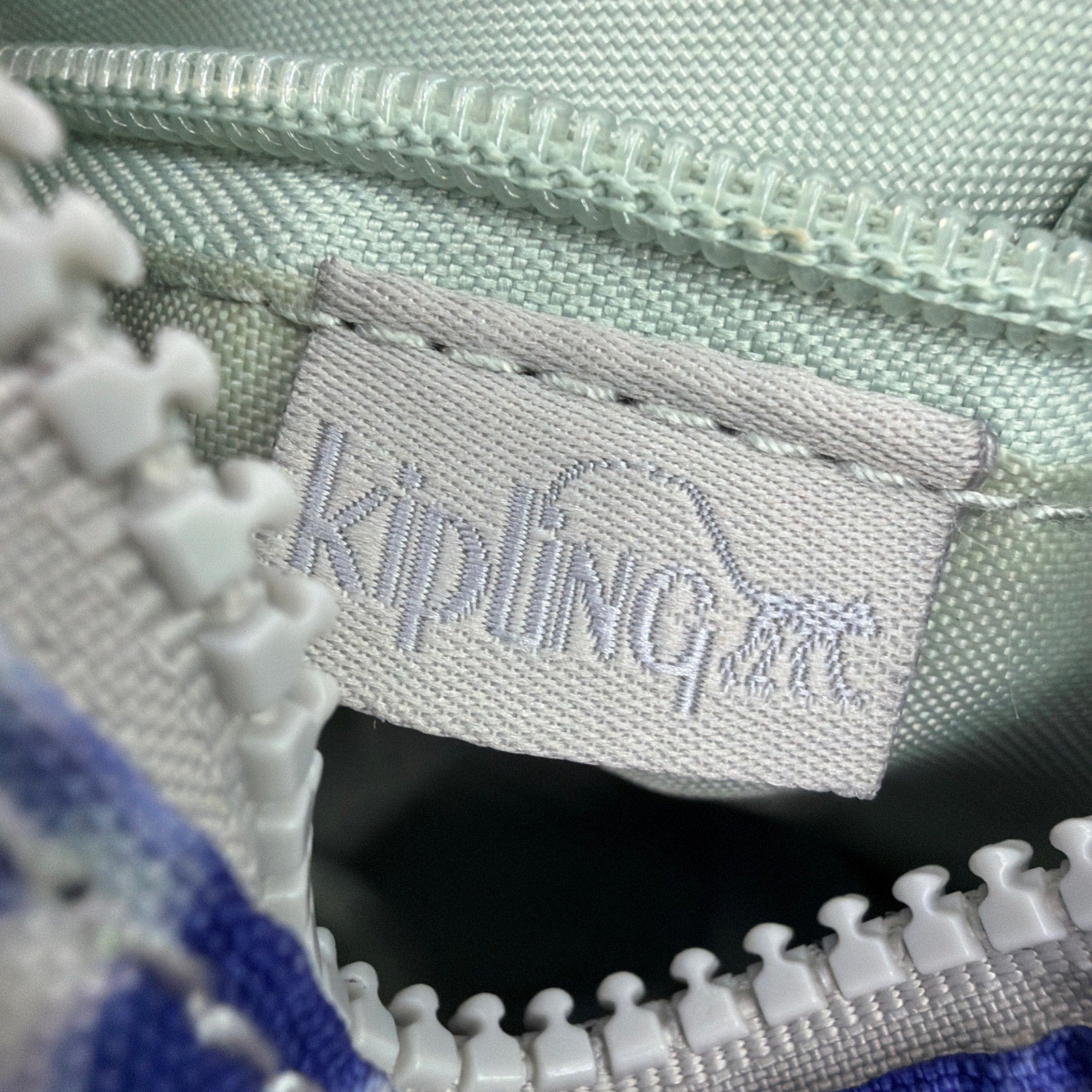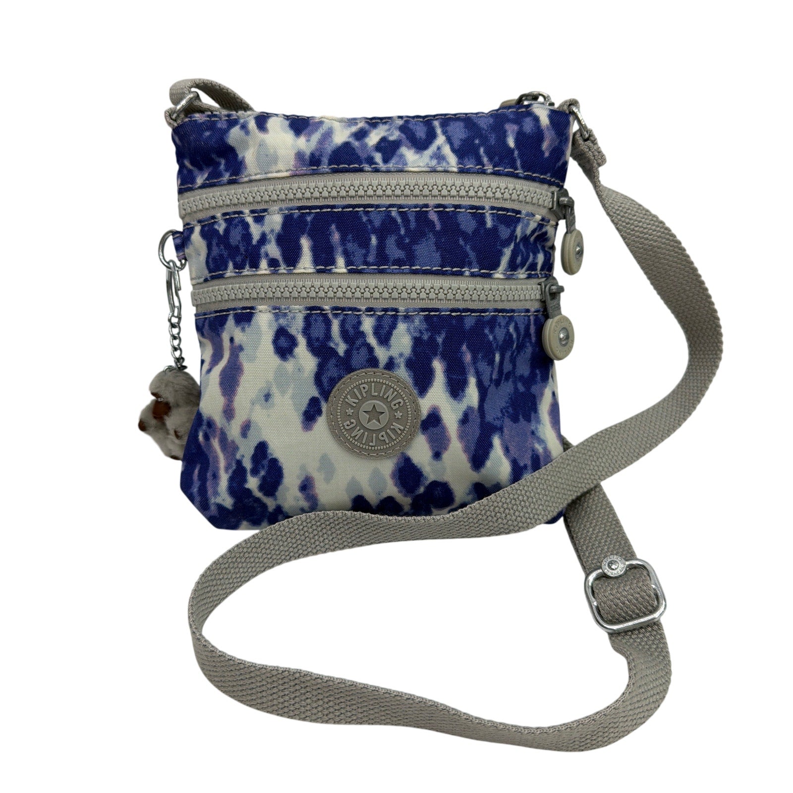 Small Kipling crossbody bag in a blue/white print with gray adjustable strap and zip compartments. Approx. 7 in tall x 6.5 in wide. Pre-owned with light signs of wear; hardware may show minor scuffs. Includes attached Kipling monkey keychain charm.