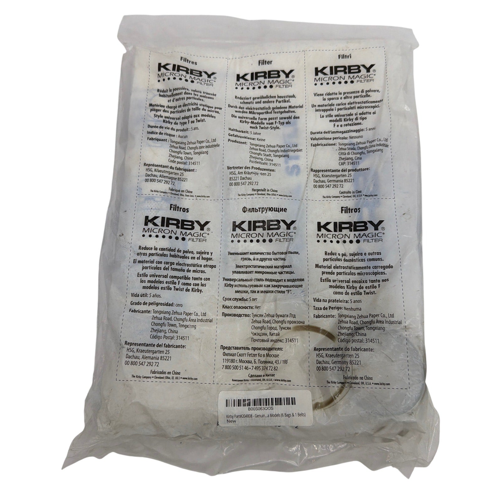 Factory-sealed 6-pack of genuine Kirby Micron Magic vacuum filter bags, universal style for both F-style and twist-style Kirby models. Outer plastic packaging has noticeable creasing, dirt marks, and a small tear at one corner, but remains sealed and the bags inside appear unused. Packaging corresponds to Kirby’s Micron Magic universal bags often associated with part numbers such as 204811/204814, but buyers should confirm compatibility with their specific model.