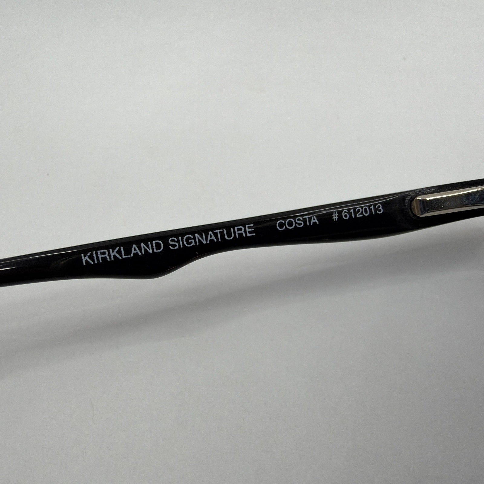 Kirkland Signature Costa sunglasses frame marked #612013. Sold as frame only; the lenses are damaged and will need to be replaced. Frame shows typical pre-owned wear, and the nose pads show some discoloration. Includes the Costco Optical case shown.