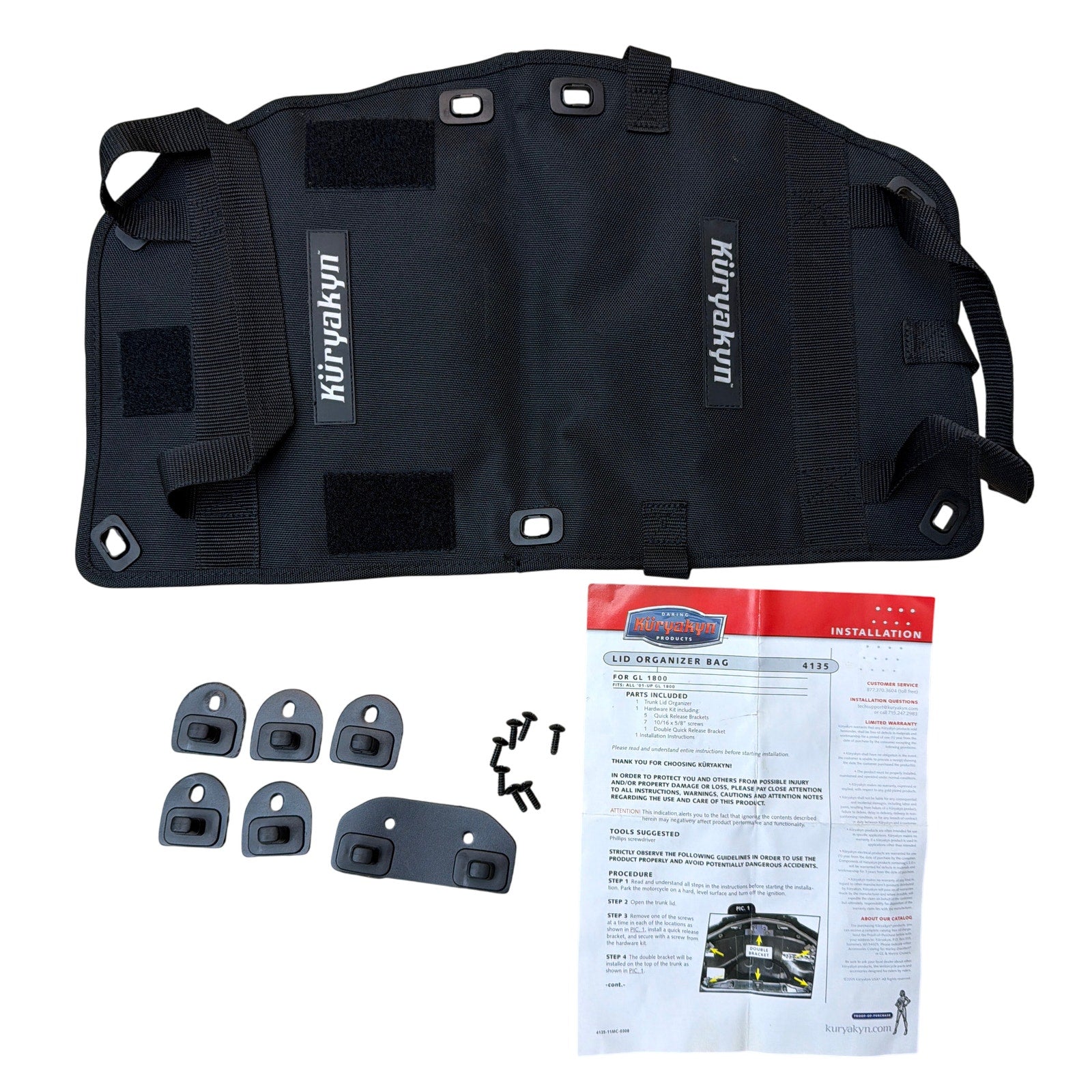 Kuryakyn lid organizer bag model 4135 for Honda Gold Wing GL1800 trunk lids, black. Includes the fabric organizer panel, mounting brackets with quick-release posts, screws, and printed installation instructions as shown. Item appears gently used with very light signs of handling on the hardware and paperwork but no obvious tears, stains, or damage to the organizer itself. Guaranteed to be fully functional and ready for installation on compatible GL1800 trunk lids.