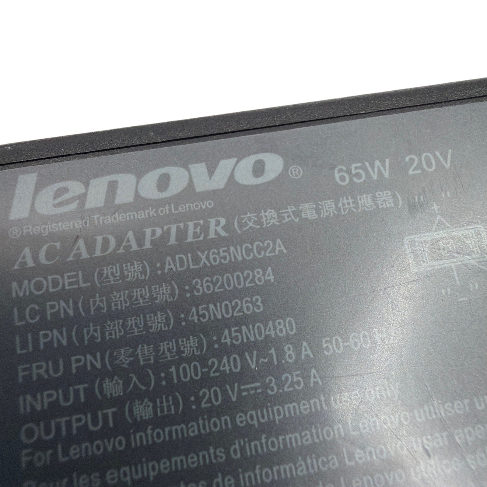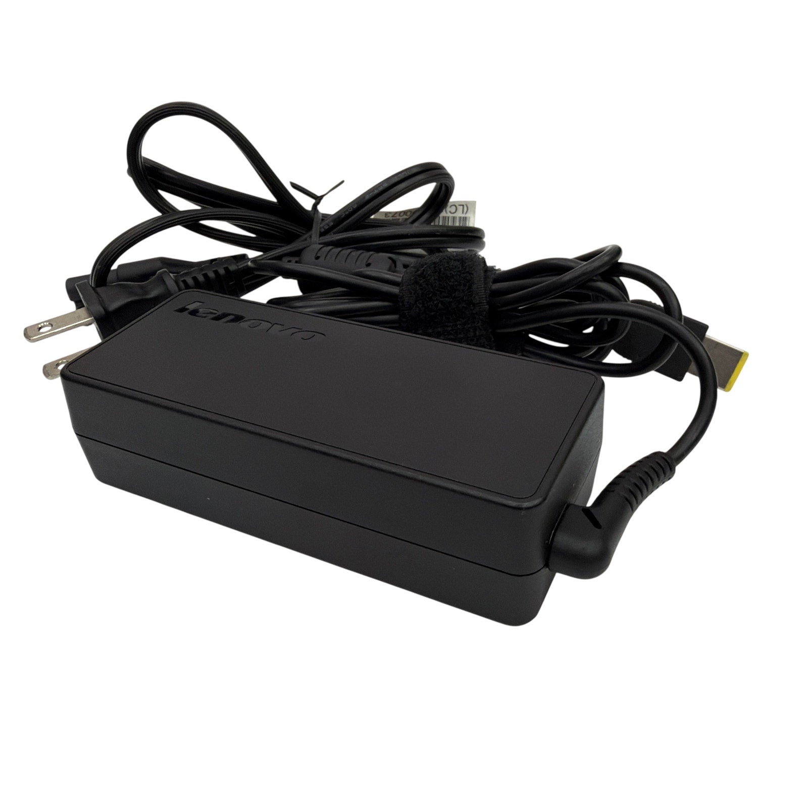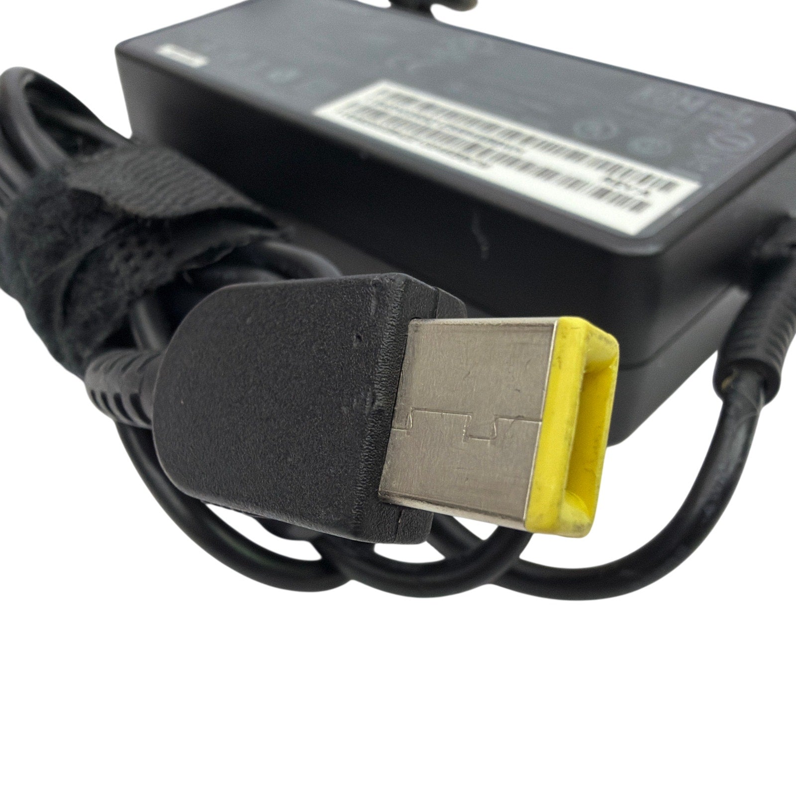 Original Lenovo 65W 20V AC adapter, model ADLX65NCC2A (FRU 45N0480), with rectangular yellow slim-tip connector. Tested and fully functional. Includes the power supply brick and AC power cord shown. Housing and cables show minor signs of previous use, such as light surface scuffs.