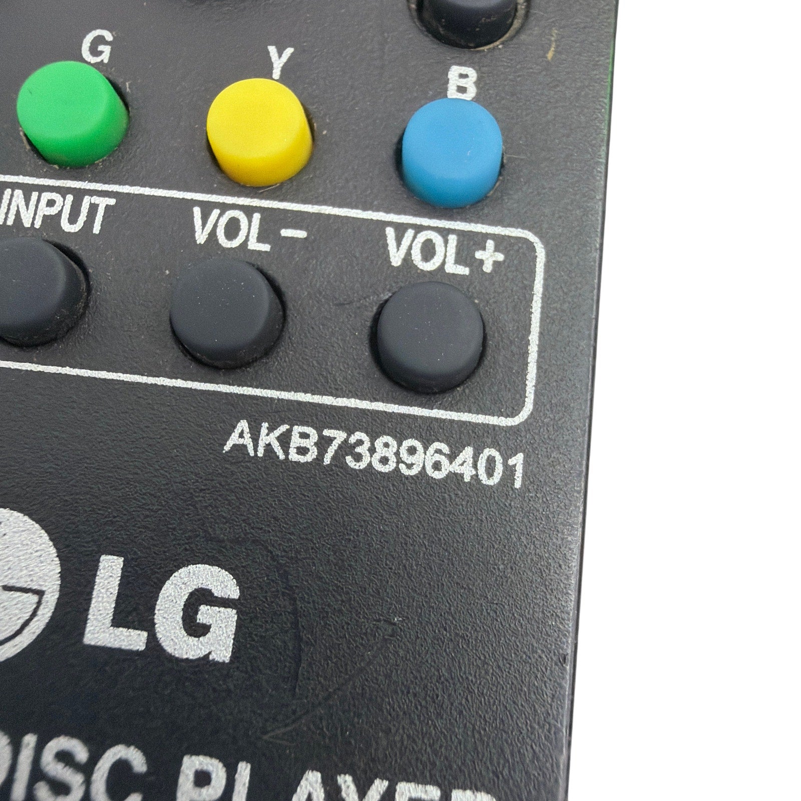Original LG Blu-ray Disc Player remote control, model AKB73896401. Remote has been tested and is fully functional. Cosmetic condition appears generally good with some light surface wear from normal use. Battery compartment is missing the battery cover, as shown in the photos; no batteries are included.