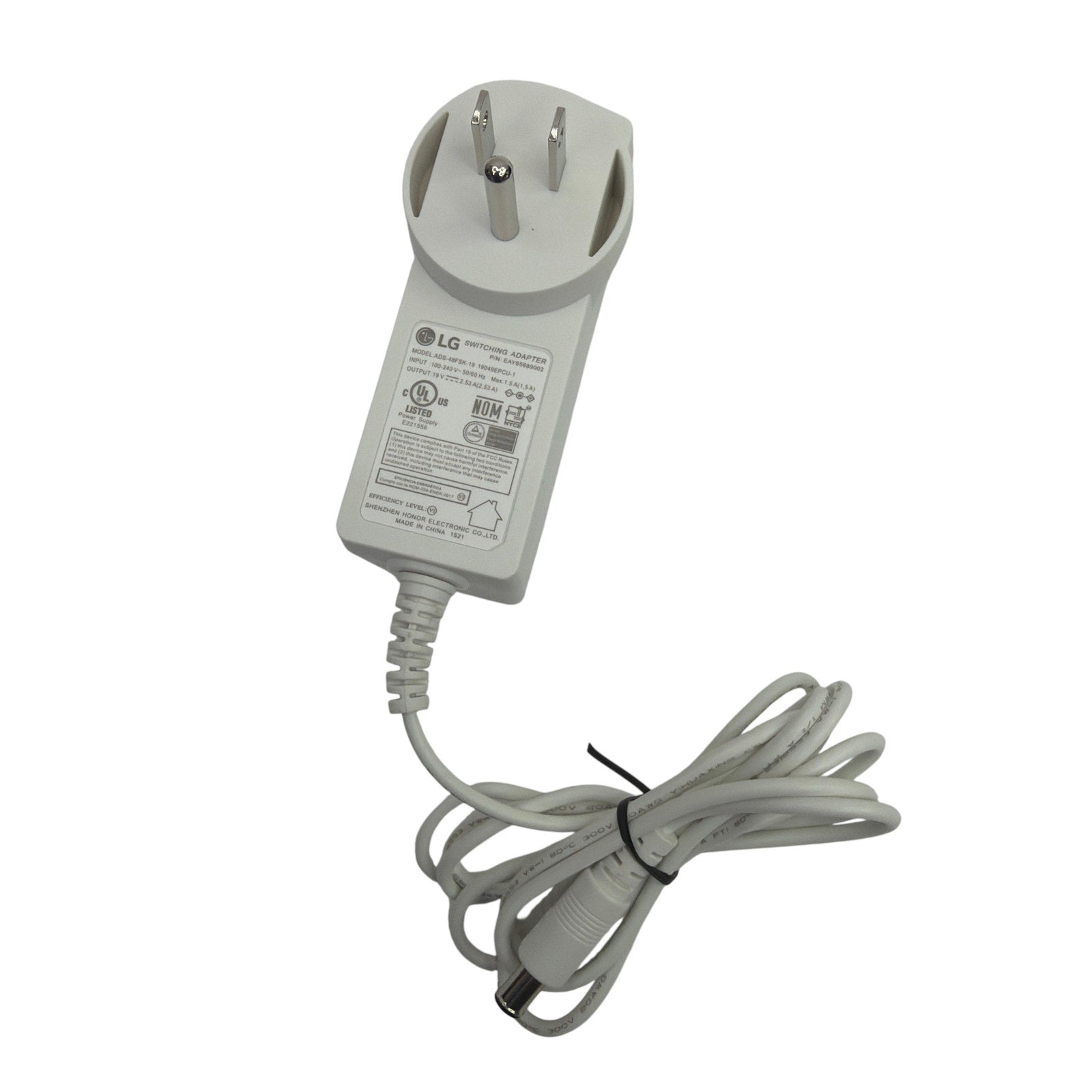 LG switching AC adapter power supply, model ADS-48FSK-19 (P/N EAY65689002) with 19V 2.53A output. Tested working. Pre-owned and may show light cosmetic wear from normal use. Includes the adapter with attached cable as shown.