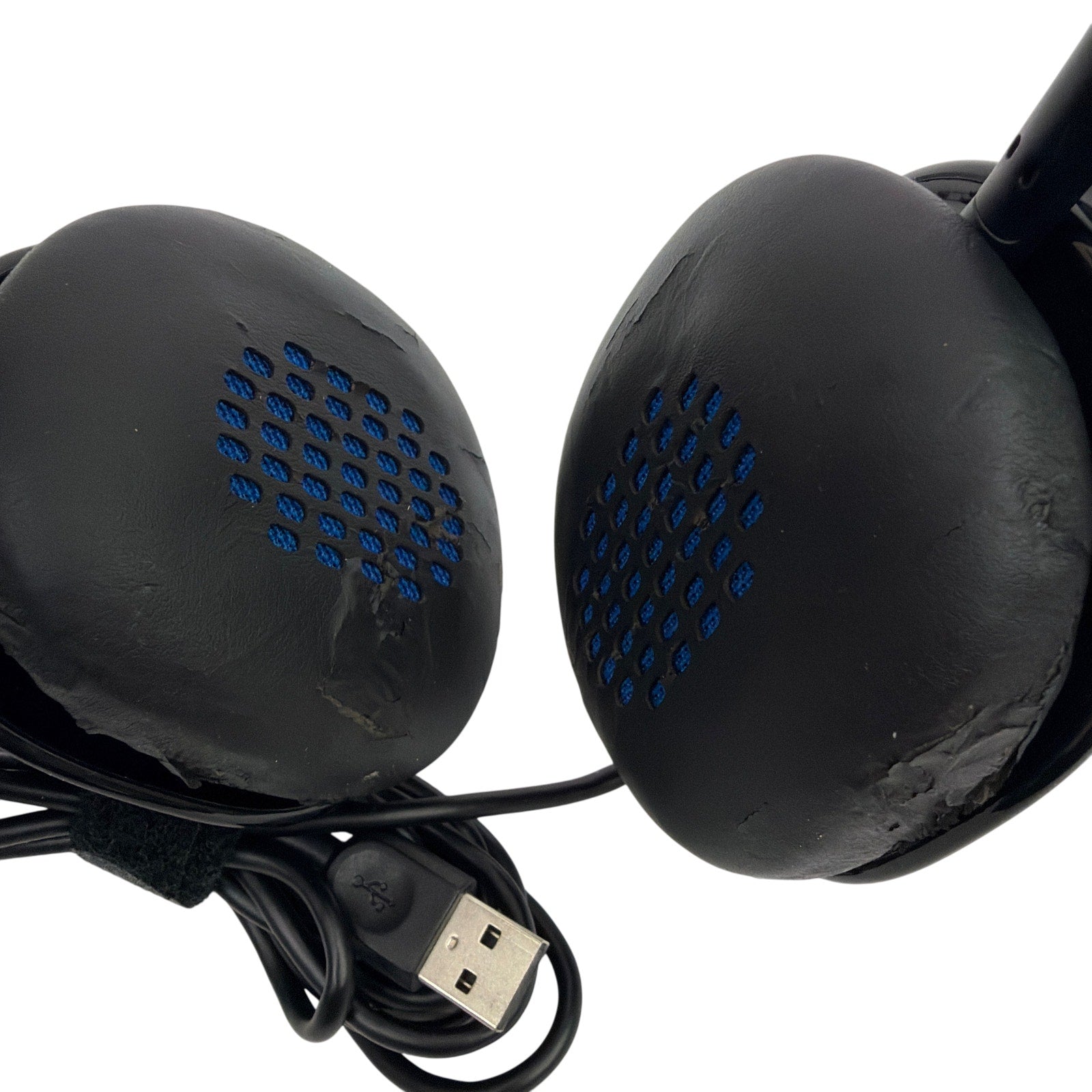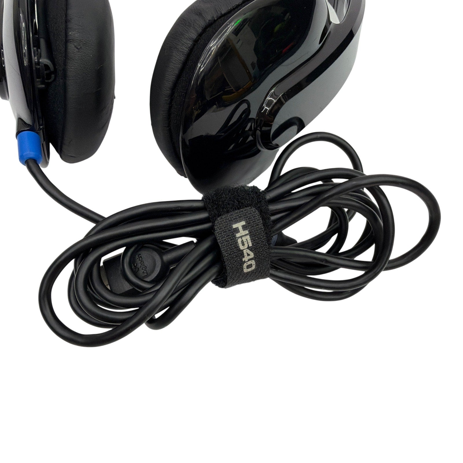 Logitech H540 wired USB headset (model 981-000510), tested working. Pre-owned with noticeable cosmetic wear, including peeling/flaking on the headband and ear pads, plus scuffs on the exterior. Includes the headset with attached USB cable only; no other accessories are shown.
