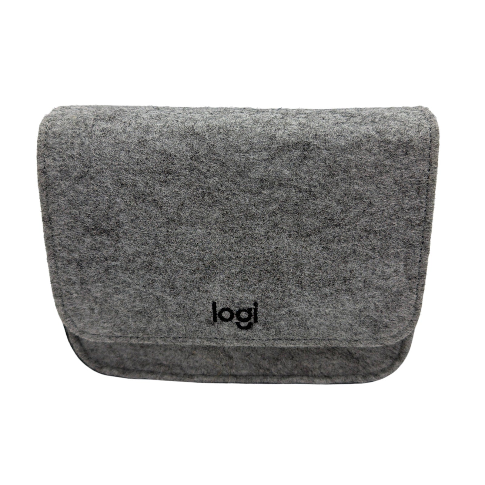 Logitech “logi” gray felt pouch/case, approximately 7 x 5 x 2.5 inches. Features a fold-over flap and an interior divider/pocket as shown. Pre-owned with light surface wear and lint/fuzz from normal use; edges may show minor fraying. Includes pouch only.