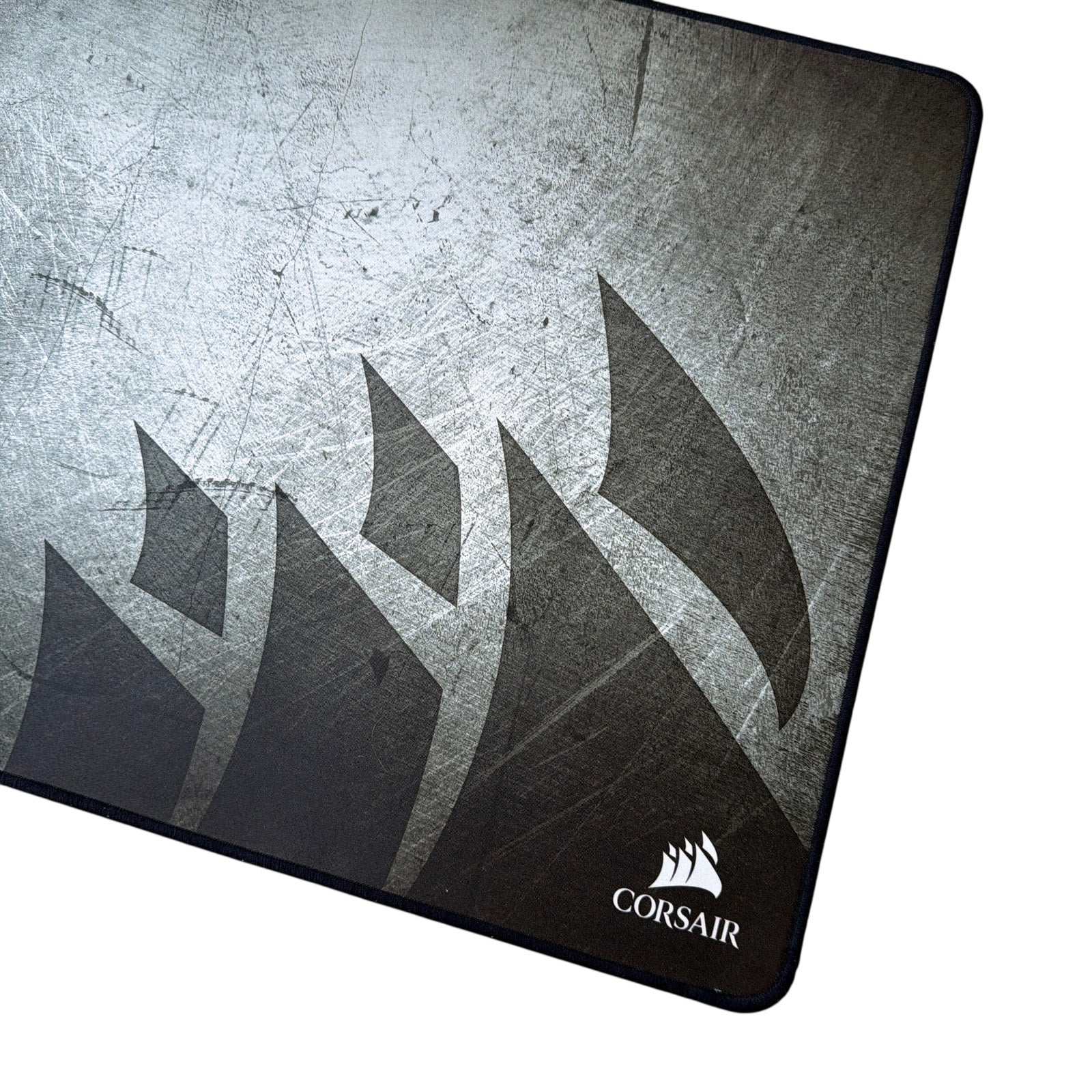 Two Corsair extended desk mouse pads are included (slightly different models/logos). Each is approximately 36 x 16 inches. Pre-owned with visible wear, including surface marks/discoloration and edge fraying; may have additional signs of use. Only the two pads shown are included.