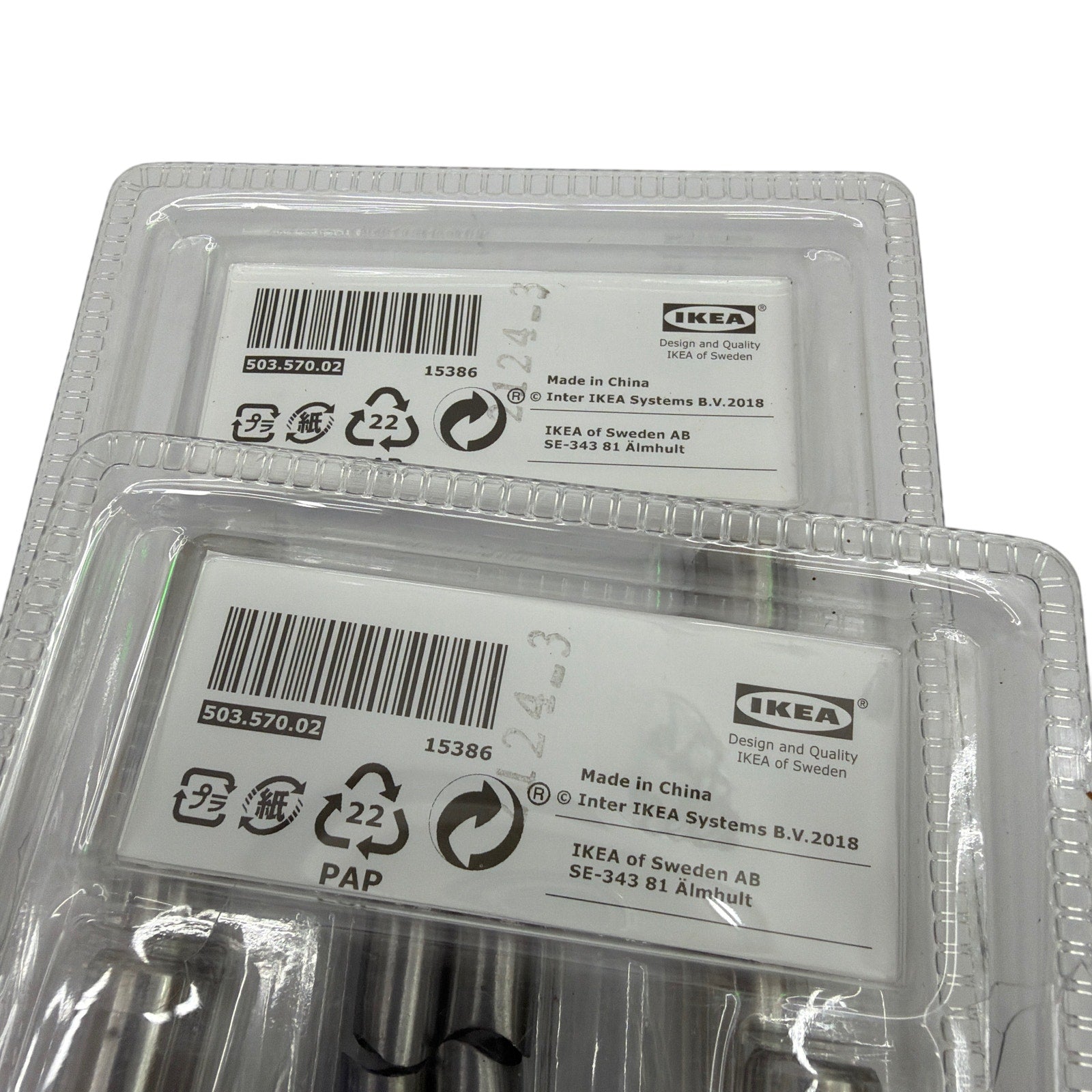Lot of 2 IKEA KALLRÖR stainless steel handle packs, model 503.570.02. Each unopened pack includes two 213 mm handles with 160 mm (6 5/16") center-to-center spacing and mounting screws, for a total of four handles and hardware. Items appear unused and guaranteed to be fully functional. Retail blister packaging shows some cracking, marks, and general shelf wear, but contents appear unaffected.
