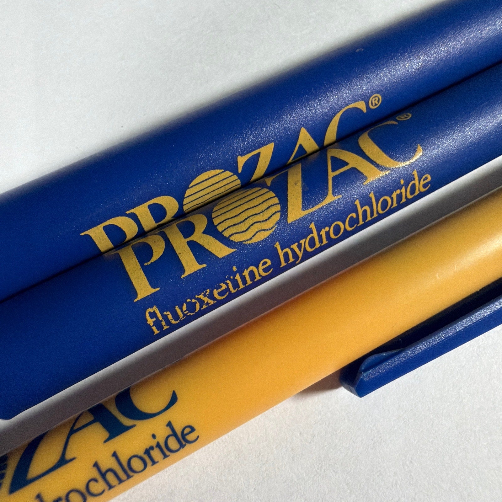 Lot includes three Prozac (fluoxetine hydrochloride) promotional pens as shown (two blue and one blue/yellow). All pens were tested and are working. Cosmetics show typical pre-owned wear such as scuffs/scratches and some wear to the printed lettering and clips.