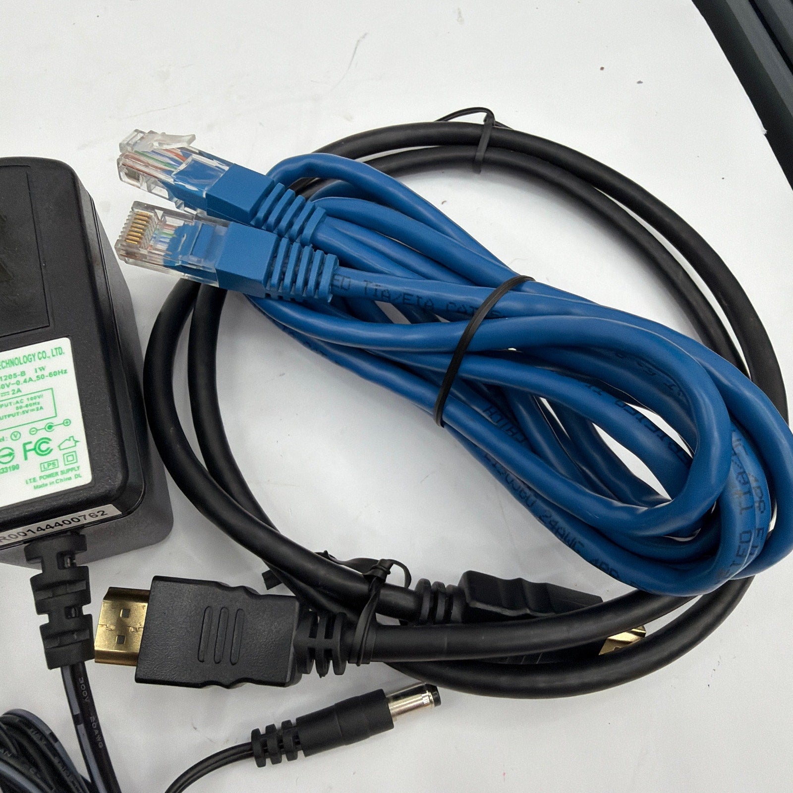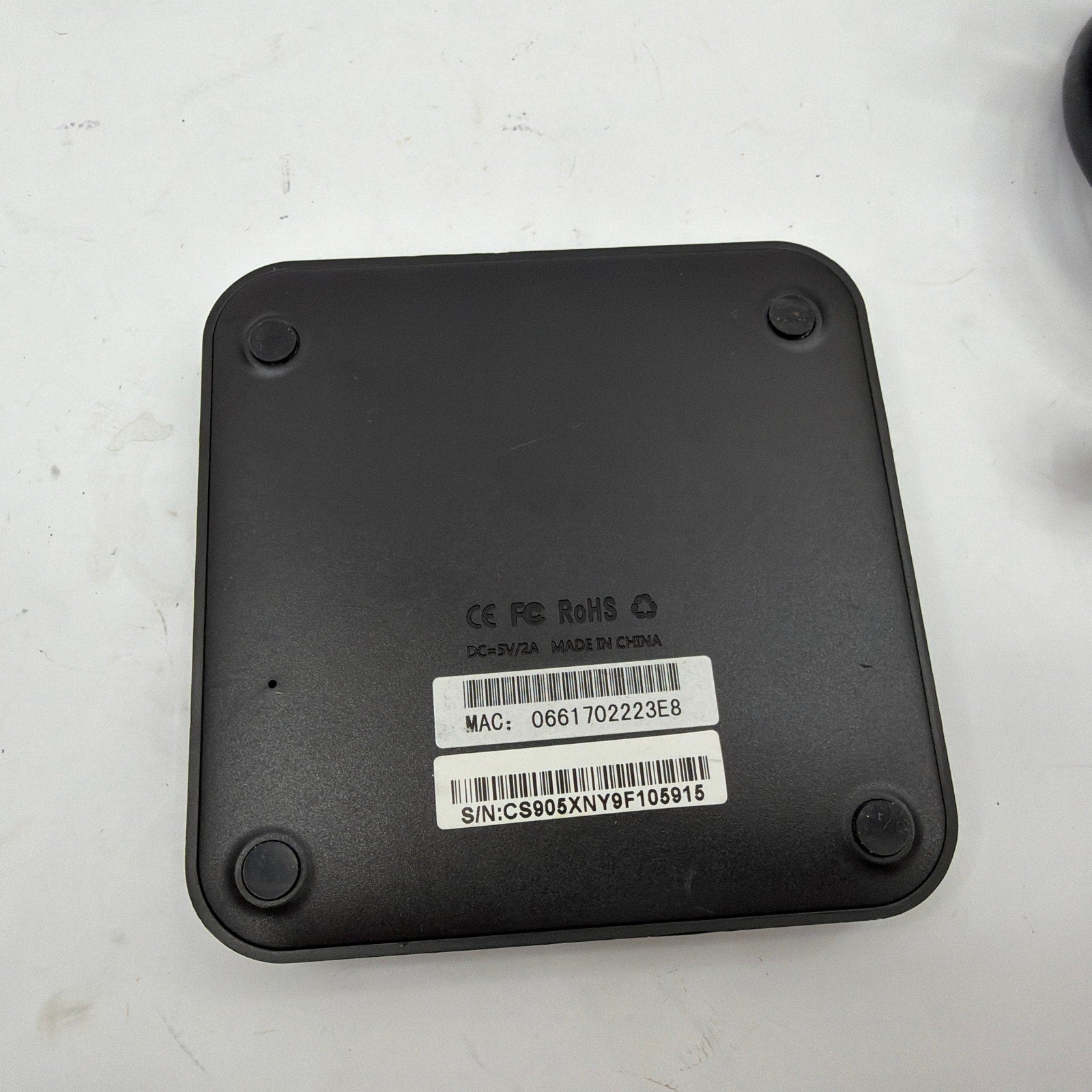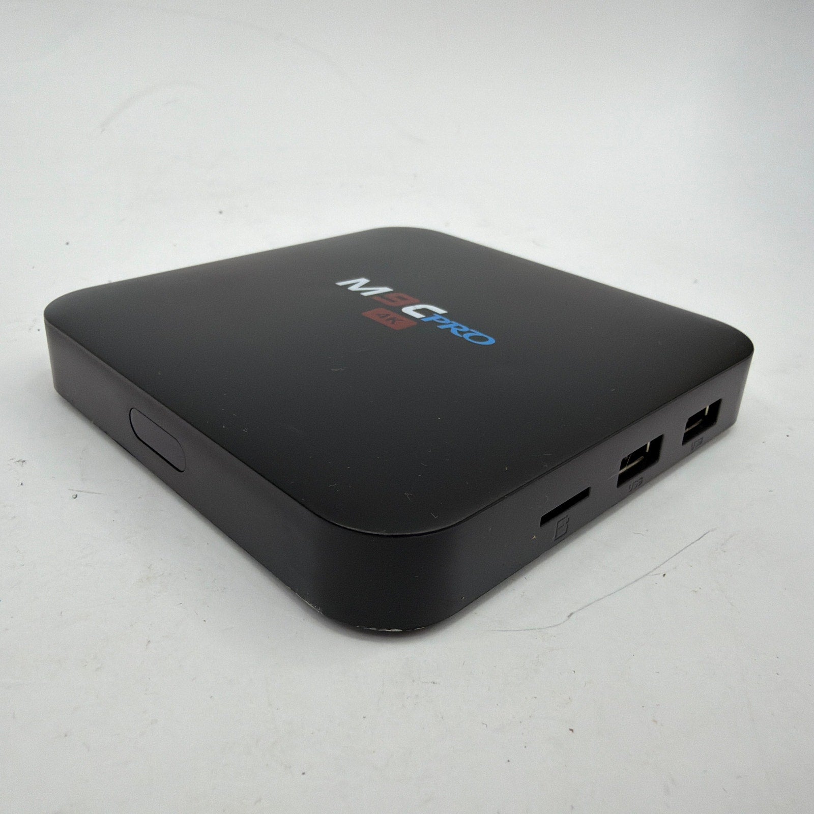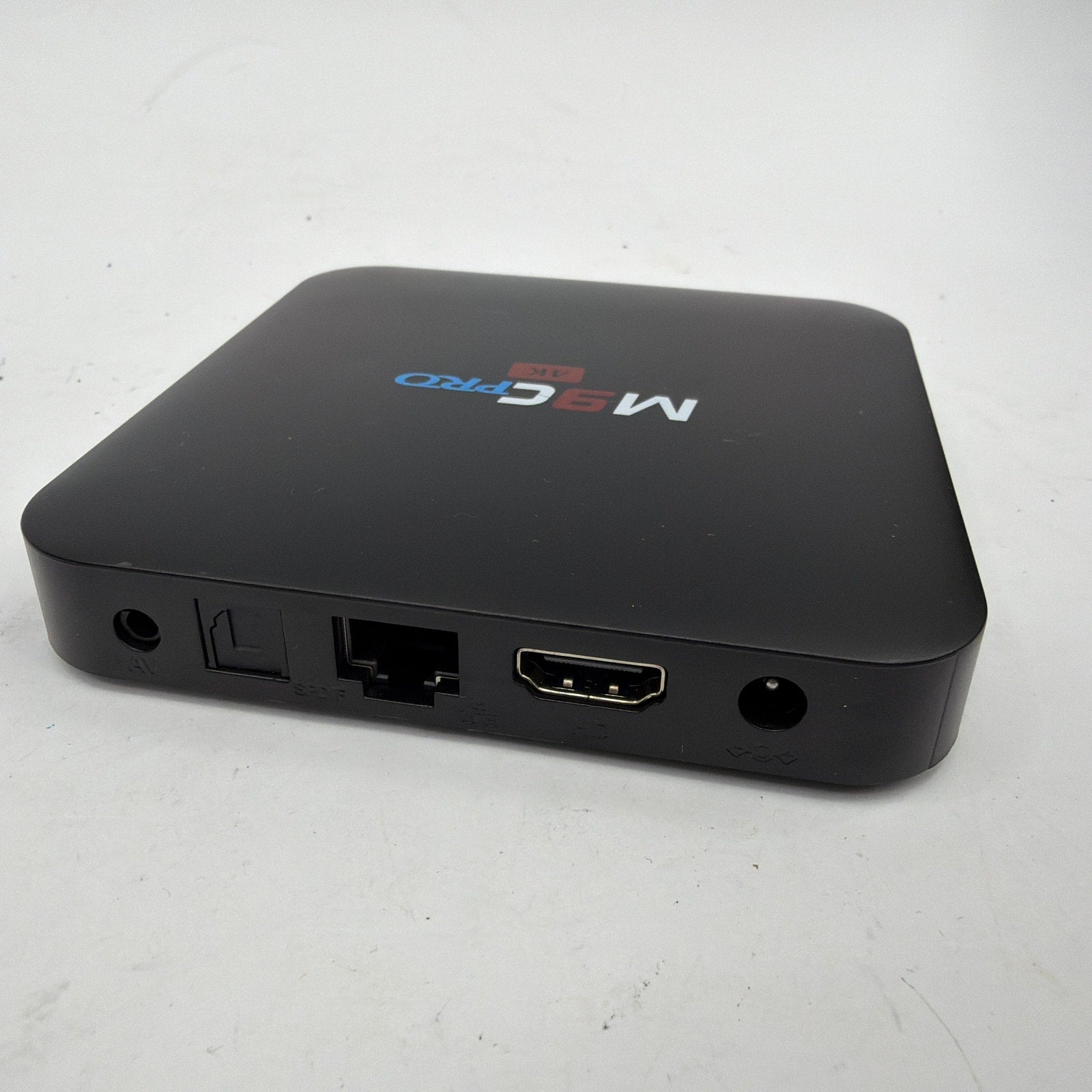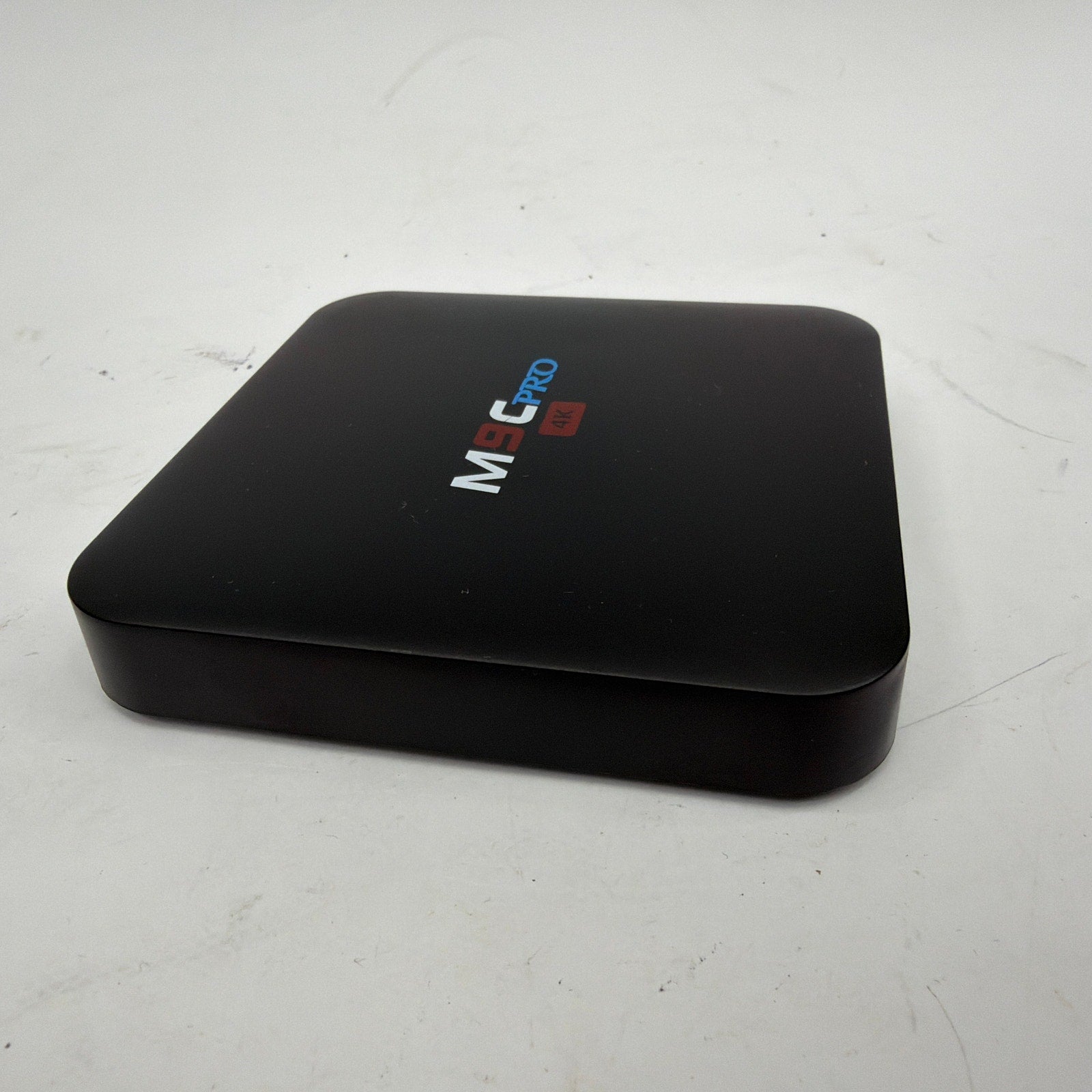 M9C Pro 4K Android TV box with 8GB storage, tested working and reset to factory settings. Shows normal cosmetic wear from prior use (light scuffs/marks may be present). Includes the TV box, power adapter, HDMI cable, and Ethernet cable—only what’s shown is included (no remote).