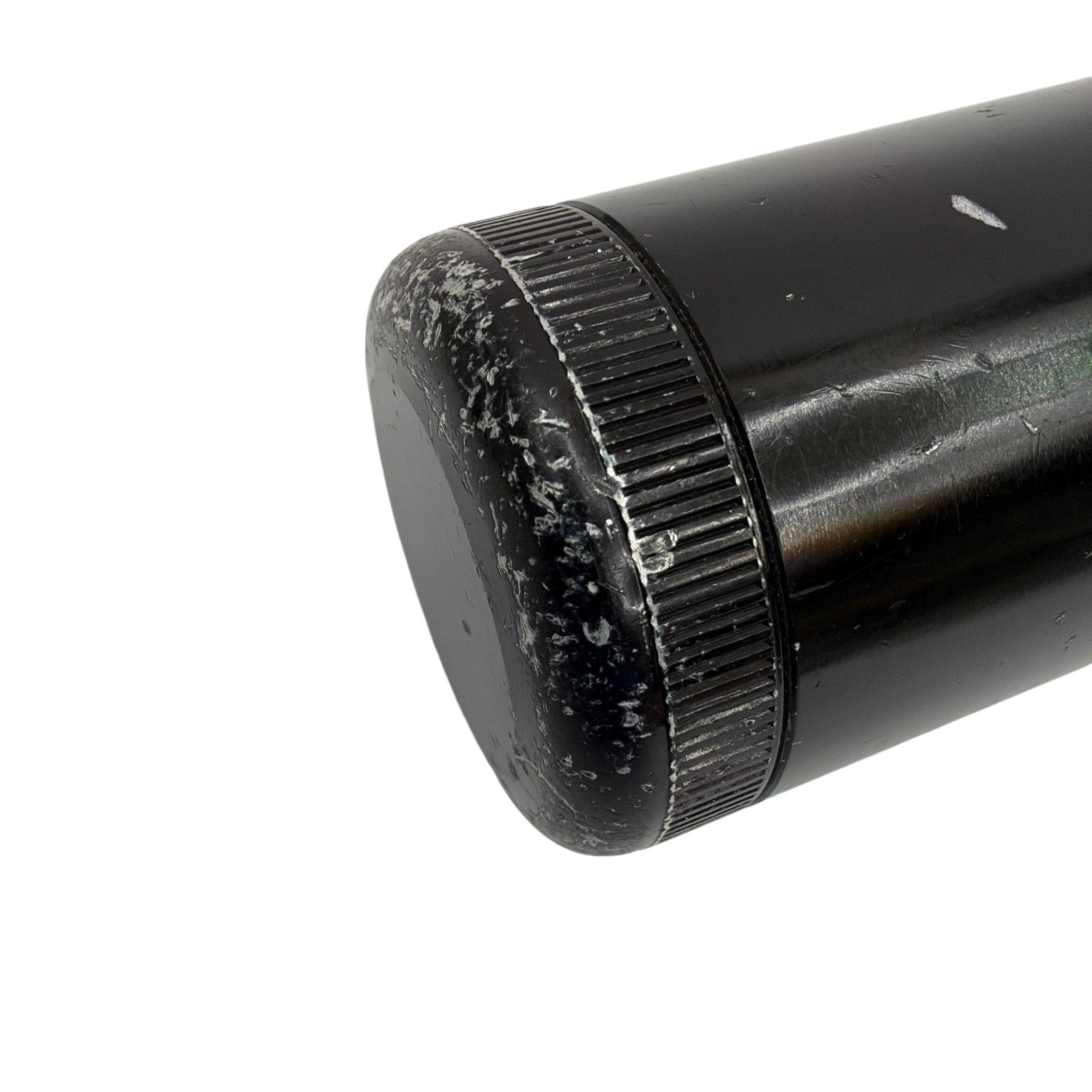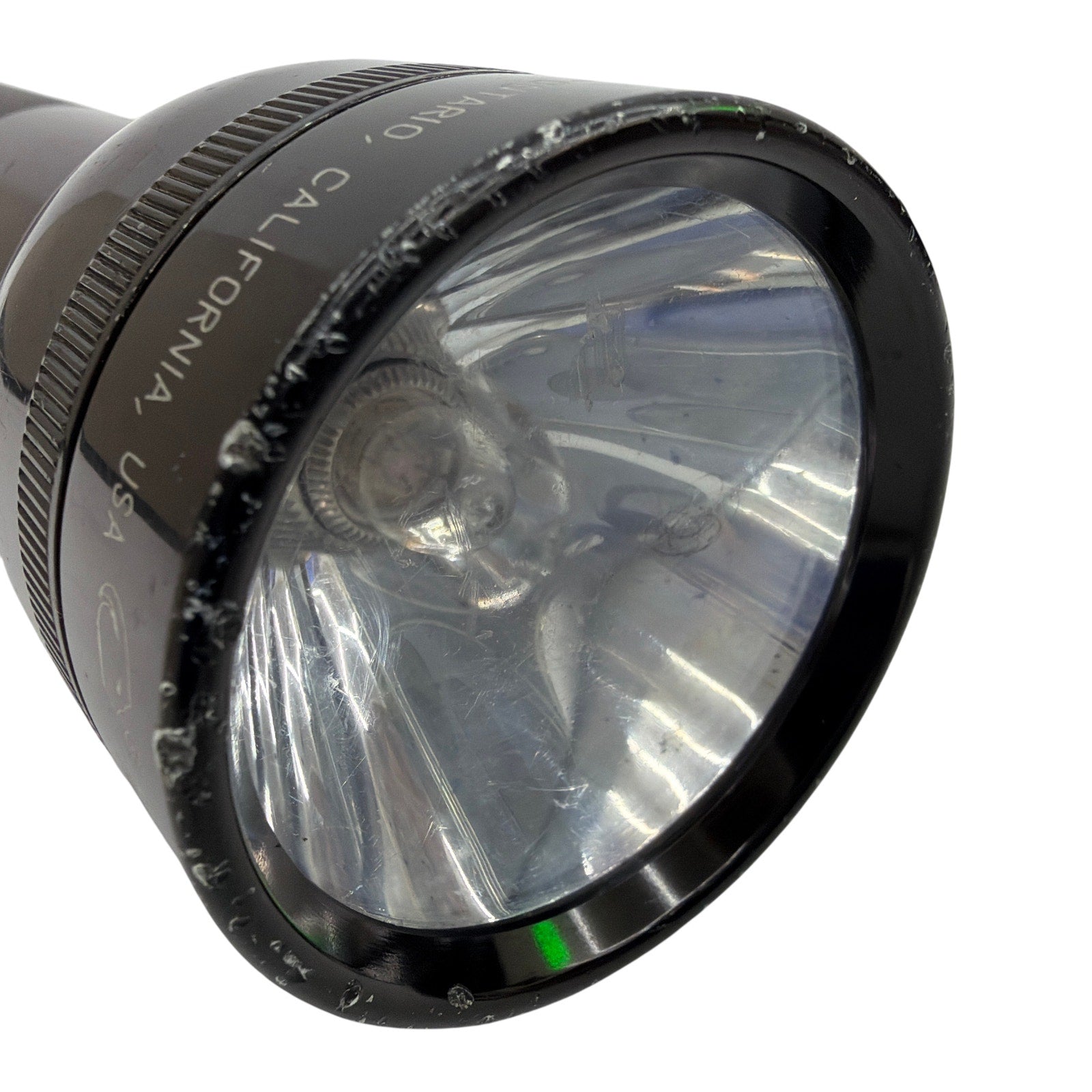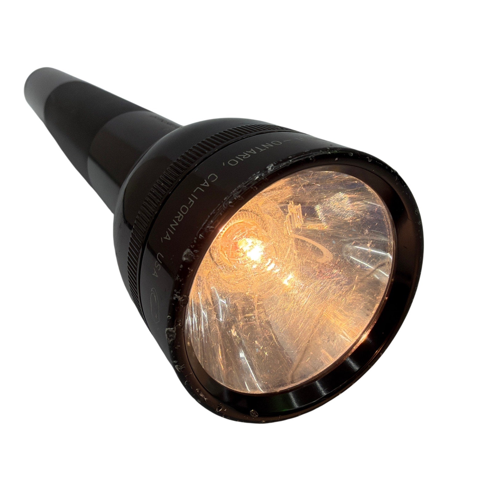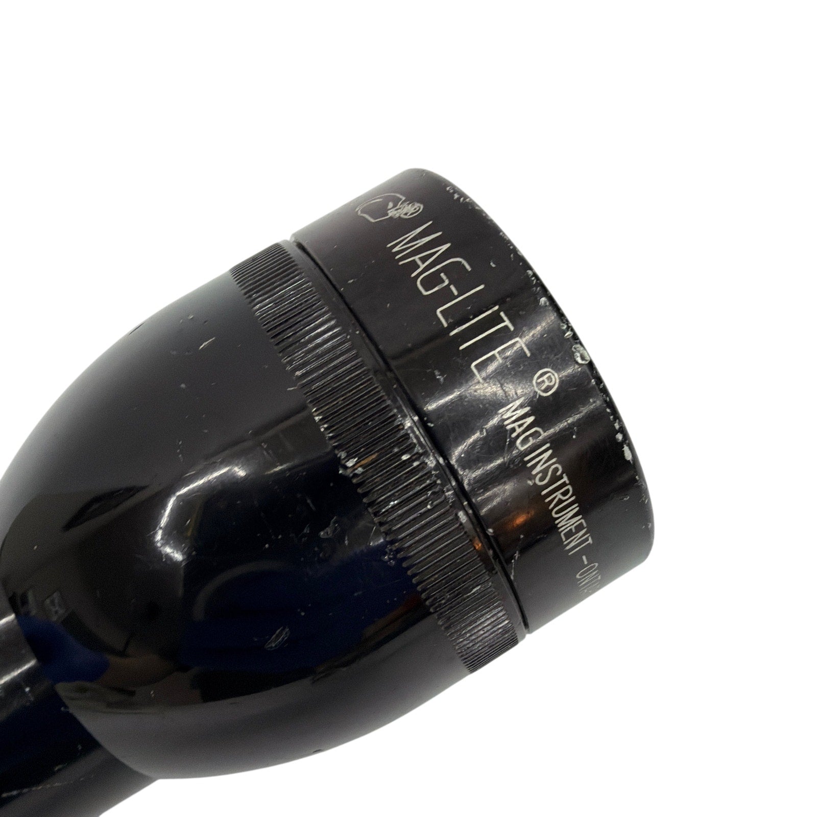 Mag-Lite 4D-cell black aluminum flashlight. Tested working. Shows cosmetic wear from use, including scuffs/scratches and lens wear. Requires 4 D-cell batteries (not included).
