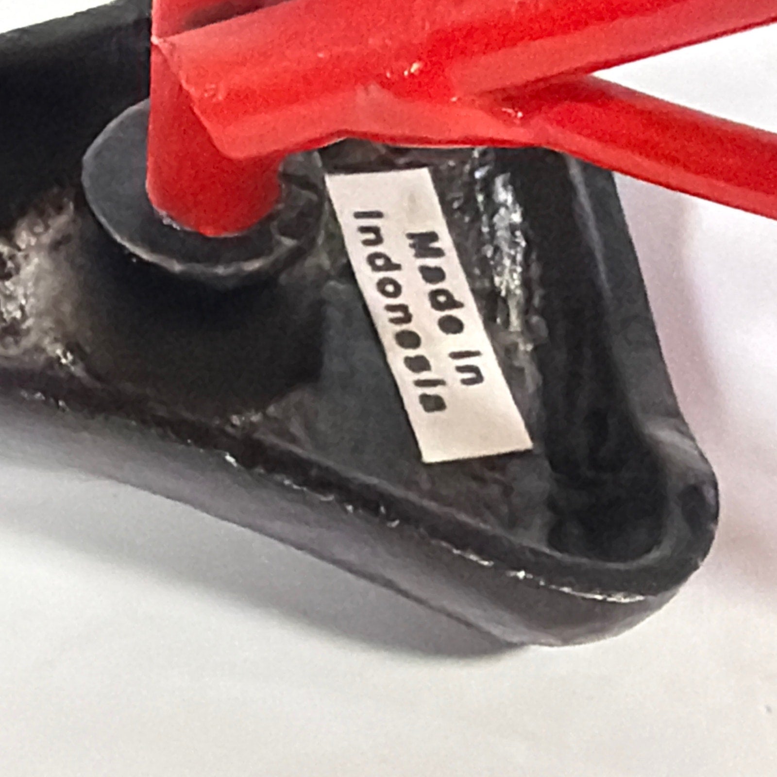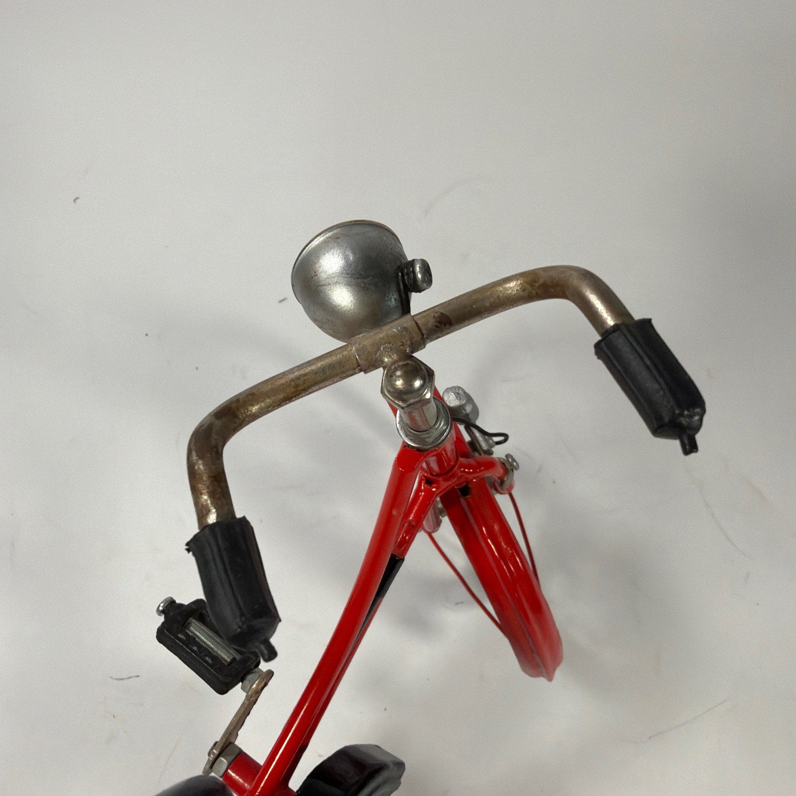 Metal bicycle model/figurine with a red frame, black chain guard, and silver-tone wheels. Pedals turn and move the wheel. Approximate overall size is 11 x 8 x 3 inches. Pre-owned with noticeable surface wear, including scuffs, small paint chips, a broken wire, and some oxidation/rust on metal parts. Includes the bicycle model and stand as shown.