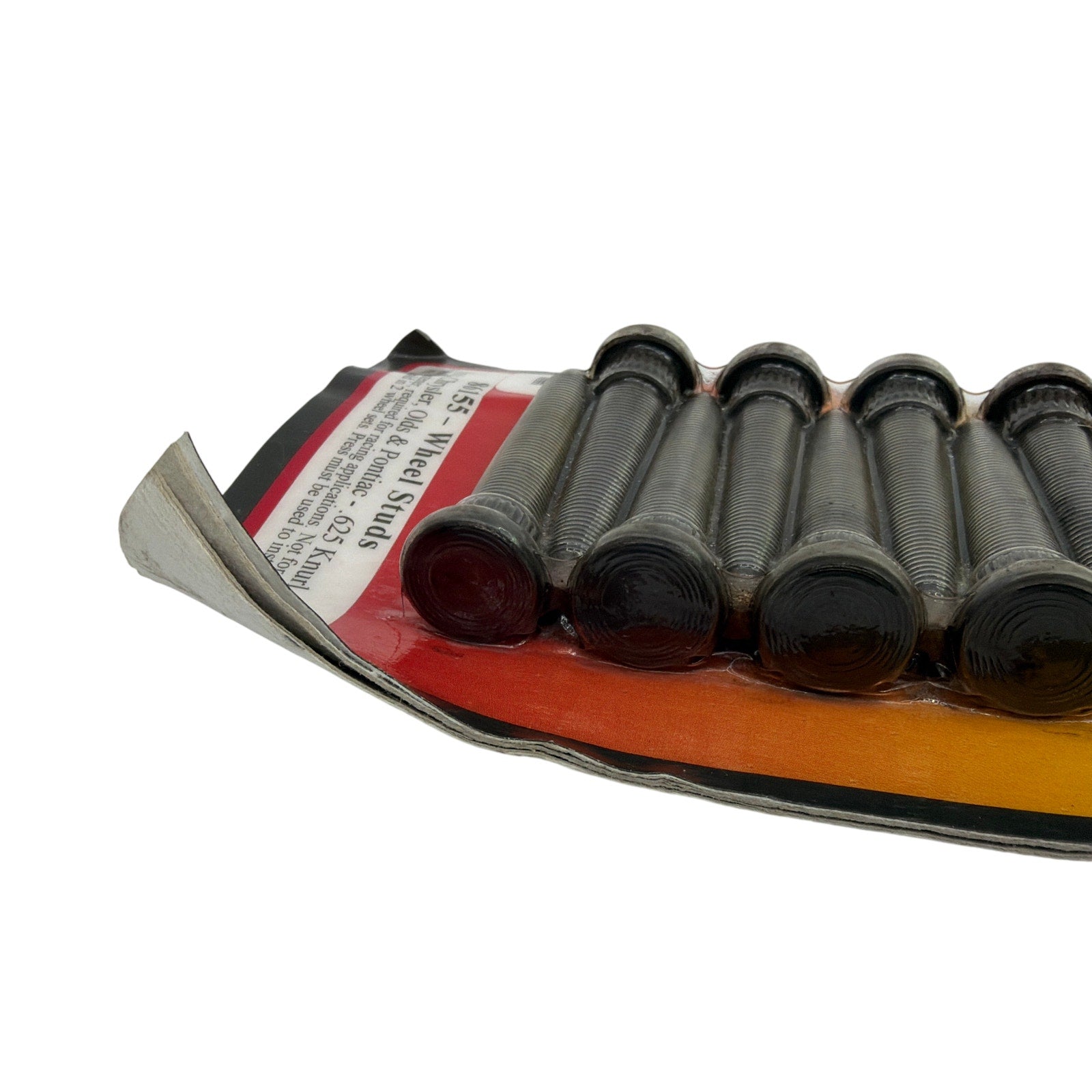 Milodon wheel studs, part number 86155 (press-in), with 1/2-20 RH threads, 3 in underhead length, and .625 in knurl. Packaging indicates fitment for Ford/Chrysler/Oldsmobile/Pontiac applications and notes not for disc brakes. Package has noticeable storage wear (bends/creases and staining), while the studs appear unused; includes the studs shown in the photos.