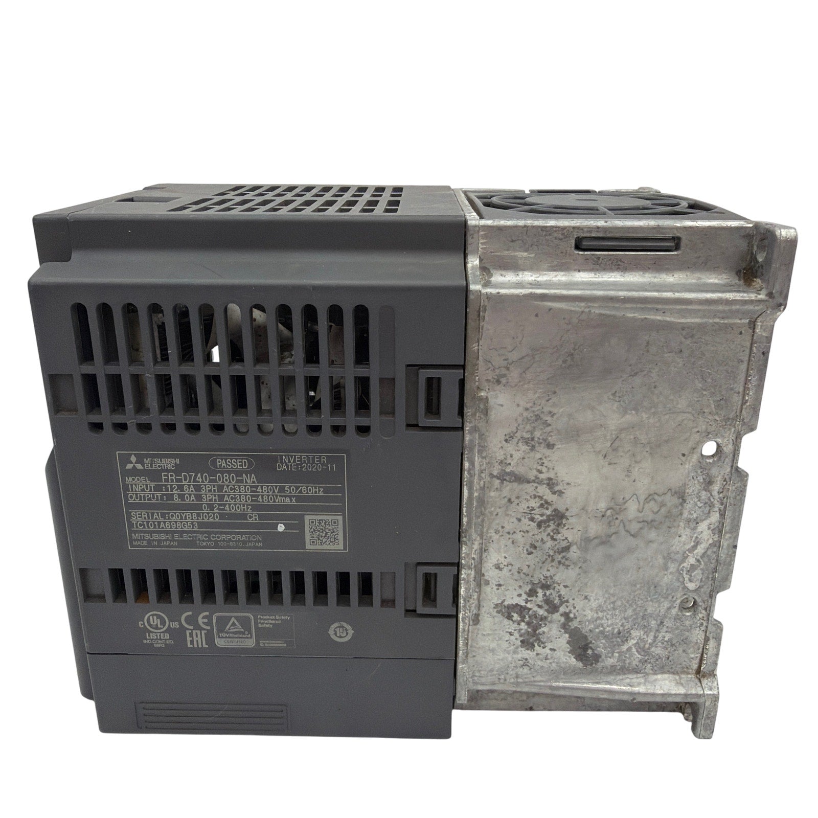 Mitsubishi Electric FR-D740-080-NA NexRev DrivePak variable frequency drive, 3-phase, 380–480V, offered strictly for parts or repair. Unit was removed from service and left for scrap and is assumed non-working/needs repair. Shows heavy cosmetic wear including oxidation, discoloration, and grime on the metal heatsink and general exterior wear as shown. No internal inspection or testing has been performed. Listing is for the inverter module only; no cables, manuals, or additional accessories are included.